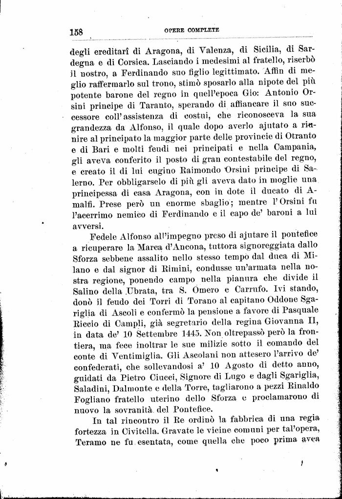 Fedele Alfonso all'impegno preso di ajutare il pontefice a ricuperare la Marca d'Ancona, tuttora signoreggiata dallo Sforza sebbene assalito nello stesso tempo dal duca di Milano e dal signor di Rimini, condusse un'armata nella nostra regione, ponendo campo nella pianura che divide il Salino della .librata, tra 8. Òmero e Carrnfo. Ivi stando, donò il feudo dei Torri di Tonino al capitano Oddone Sga-riglia di Ascoli e confermò la pensione a favore di Pasquale Riccio di Campii, già segretario della regina Giovanna II, in data de' 10 Settembre 1445. Fon oltrepassò però la frontiera, ma fece inoltrai* le sue milizie sotto il comando del conte di Ventimiglia. Gli Ascolani non attesero l'arrivo de' confederati, che sollevandosi a' 10 Agosto di detto anno, guidati da Pietro Ciucci, Signore di Lugo e dagli Sgariglia, Saladini, Dalmonte e della Torre, tagliarono a pezzi Rinaldo Fogliano fratello uterino dello Sforza e proclamarono di nuovo la sovranità del Pontefice.