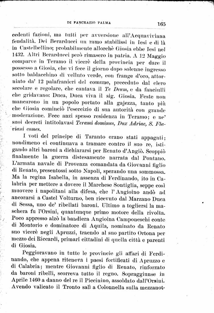 I voti del principe di Taranto erano stati appagati ; nondimeno ei continuava a tramare contro il suo re, istigando altri baroni a dichiararsi per Renato d'Angiò. Scoppiò finalmente la guerra distesamente narrata dal Fontano. L'armata navale di Provenza comandata da Giovanni figlio di Renato, presentossi sotto Napoli, sperando una sommossa. Ma la regina Isabella, in assenza di Ferdinando, ito in Calabria per mettere a dovere il Marchese Sontiglia, seppe così muovere i napolitani alla difesa, che 1' Angioino andò ad ancorarsi a Oastel Volturno, ben ricevuto dal Marzano Duca di Sessa, uno de' ribellati baroni. Ultimo a togliersi la maschera fu l'Orsini, quantunque primo motore della rivolta. Poco appresso alzò la bandiera Angioina Oampoueschi conte di Montorio e dominatore di Aquila, nominato da Renato suo viceré negli Apruzzi, traendo al suo partito Ortona per mezzo dei Riccardi, primarì cittadini di quella città e parenti di Giosia.