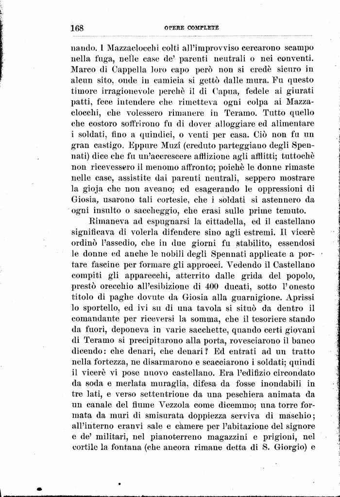 naiido.,1 Mazzaclocchi colti all'improvviso cercarono scampo nella fuga, nelle case de' parenti neutrali o nei conventi. Marco di Cappella loro capo però non si credè sicuro in alcun sito, onde in camicia si gettò dalle mura. Fu questo timore irragionevole perché il di Capua, fedele ai giurati patti, fece intendere che rimetteva ogni colpa ai Mazza-ciocchi, che volessero rimanere in Teramo. Tutto quello che costoro soffrirono fu di dover alloggiare ed alimentare i soldati, fino a quindici, o venti per casa. Ciò non fu un gran castigo. Eppure Muzl (creduto parteggiano degli Spennati) dice che fu un'accrescere afflizione agli afflitti; tuttoché non ricevessero il menomo affronto; poiché le donne rimaste nelle case, assistite dai parenti neutrali, seppero mostrare la gioja che non aveano; ed esagerando le oppressioni di Giosia, usarono tali cortesie, che i soldati si astennero da ogni insulto o saccheggio, che erasi sulle prime temuto.
