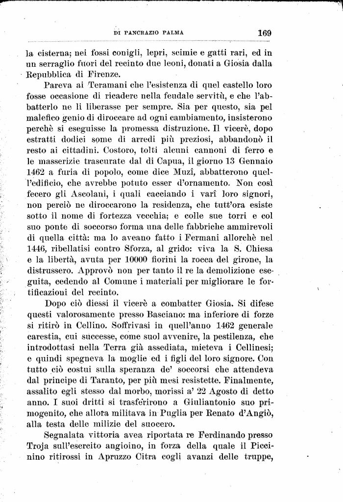 Dopo ciò diessi il viceré a combatter Giosia. Si difese questi valorosamente presso Basciano: ma inferiore di forze si ritirò in Celiino. Soffrivasi in quell'anno 1462 generale carestia, cui successe, come suoi avvenire, la pestilenza, che introdottasi nella Terra già assediata, mieteva i Celiinosi; e quindi spegneva la moglie ed i figli del loro signore. Con tutto ciò costui sulla speranza de' soccorsi che attendeva dal principe di Taranto, per più mesi resistette. Finalmente, assalito egli stesso dal morbo, morissi a' 22 Agosto di detto anno. I suoi dritti si trasferirono a Giuliantonio suo primogenito, che allora militava in Puglia per Eenato d'Angiò, alla testa delle milizie del suocero.