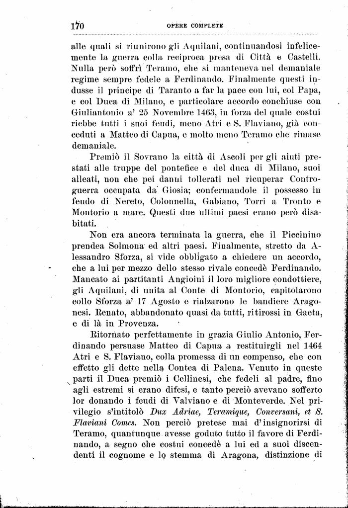 alle quali si riunirono gli Aquilani, continuandosi infelicemente la guerra colla reciproca presa di Città e Castelli. Nulla però soffrì Teramo, che si manteneva nel demaniale regime sempre fedele a Ferdinando. Finalmente questi indusse il principe di Taranto a far la pace con Ini, col Papa, e col Duca di Milano, e particolare accordo conchiuse con Giuliantouio a' 25 Novembre 1463, in forza del quale costui riebbe tutti i suoi feudi, meno Atri e S. Flaviano, già conceduti a Matteo di Capua, e molto meno Teramo che rimase demaniale.