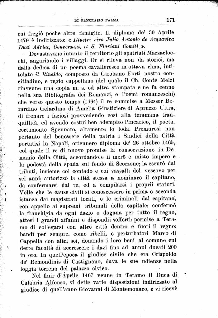 Devastavano intanto il territorio gli spatriati Mazzacloc-chi, angariando i villaggi. Or si rileva non da storici, ma dalla dedica di un poema cavalieresco in ottava rima, intitolato il Rinaldo; composto da Girolamo Forti nostro concittadino, e regio cappellano (del. quale il Oh. Conte Melzi rinvenne una copia m. s. ed altra stampata e ne fa cenno nella sua Bibliografìa dei Romanzi, e Poemi romanzeschi) che verso questo tempo (1464) il re commise a Messer Be-rardino Gelardino di Amelia Giustiziere di Apruzzo Ultra, di frenare i faziosi provvedendo così alla teramana tranquillità, ed avendo costui ben adempito l'incarico, il poeta, certamente Spennato, altamente lo loda. Premurosi non pertanto del benessere della patria i Sindici della Città portatisi in Napoli, ottennero diploma de' 26 ottobre 1465, col quale il re di nuovo promise la conservazione in Demanio della Città, accordandole il merò e misto impero e la podestà della spada sul feudo di Scorzone; la esentò dai tributi, insieme col contado e coi vassalli del vescovo per sei anni; autorizzò la città stessa a nominare il capitano, da confermarsi dal re, ed a compilarsi i proprii statuti. Volle che le cause civili si conoscessero in prima e seconda istanza dai magistrati locali, e le criminali dal capitano, con appello ai supremi tribunali della capitale: confermò la franchigia da ogni dazio o dogana per tutto il regno, attesi i grandi affanni e dispendii sofferti: permise a Tera-mo di collegarsi con altre città dentro e fuori il regno: bandì per sempre, come ribelli, e perturbatori Marco di Cappella con altri sei, donando i loro beni al comune cui dette facoltà di accrescere i dazi fino ad annui ducati 200 in oro. In quell'epoca il giudice civile che era Orispoldo de' Eempndinis di Castignano, dava le sue udienze nella loggia terrena del palazzo civico.