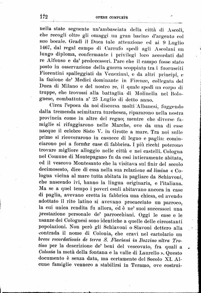Circa l'epoca da noi discorsa molti 'Albanesi, fuggendo dalla tremenda scimitarra turchesca, ripararono nella nostra provincia come in altre del regno; mentre che diverse famiglie si rifuggiarono nelle Marche, ove da una di esse nacque il celebre Sisto V. in Grotte a mare. Tra noi sulle prime si ricoverarono in casucce di legno e paglia: cominciarono poi a forrtìar case di fabbrica. I più ricchi poterono trovare migliore alloggio nelle città e nei castelli. Cologna nel Comune di Montepagano fu da essi intieramente abitata, ed il vescovo Montesanto che la visitava sul finir del secolo decimosesto, dice di essa nella sua relazione ad limino, « Cologna vicina al mare tutta abitata in pagliare da Schiavoni, che nascendo ivi, hanno la lingua originaria, e l'italiana. Ma se a quel tempo i poveri esuli abitavano ancora in case di paglia, avevano eretta in fabbrica una chiesa, ed avendo adottato il rito latino si avevano procacciato un parroco, la cui unica rendita fu allora, ed è ne' suoi successori una prestazione personale de' parrocchiani. Oggi le case e le usanze dei Cològnési sono identiche a quelle delle circostanti popolazioni. Non però gli Schiavoni o Slavoni dettero alla contrada il nome di Colonia, che eravi nel cartolario un 'breve recordationis de terra S. Fiumani in Bogzino ultra, Trotino per la descrizione de' beni del vescovato, fra quali a Colonia la metà della fontana e la valle di Laureilo ». Questo documento è senza data, ma certamente del Secolo XI. Alcune famiglie vennero a stabilirsi in Teramo, ove costruì-