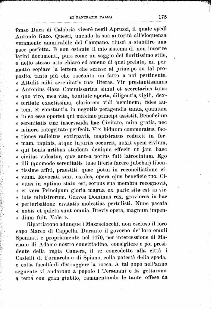 fonso Duca di Calabria viceré negli Apruzzi, il quale spedì Antonio Gazo. Questi, unendo la sua autorità all'eloquenza veramente ammirabile del Campano, riuscì a stabilire una pace perfetta. E non ostante il mio sistema di non inserire latini documenti, pure come un saggio del fioritissimo stile, e nello stesso atto chiaro ed ameno di quel prelato, mi permetto, copiare la lettera che scrisse al principe su tal proposito, tanto più che racconta un fatto a noi pertinente. « Attulit mihi serenitatis tuse literas, Vir prestantissimus « Antonius Gazo Commissarius simul et secretarius tuus: « quo viro, mea vita, bonitate aperta, diligentia vigili, dex-« teritate exactissima, clariorem vidi nemlnem; fldes au-« tem, et constantia in negotiis peragendis tanta, quantam « in eo esse oportet qui maximo principi assistit. Beueficium « serenitatis tuse inservanda hac Civitate, mira gratia, nec « minore iutegritate perfecit. Vix biduum commoratus, fac-« tiones radicitus extirpavit, magistratus reduxit in for-« mam, rapinis, atque injuriis occurrit, auxit speni civium, « qui bonis artibus student: denique effecit ut jam haec « civitas videatur, quse antea potius fuit latrociniiim. Bgo « illi (quomodo serenitatis tuae literis facere jubebar) liben-« tissime aifui, praestiti quae potili in reconciliatione ci-« vium. Eevocati sunt exules, opera ejus beneficio tuo. Ci-« vitas in optimo statu est, corpus sua membra recognovit, « et vere Principiimi gloria magna ex parte sita est in vir-« tute ministrar una. Graves Doniinus rex, graviores in hac « perturbatione civitatis molestias pertulisti. Nunc pacata « nobis et quieta sunt ornuia. Brevis opera, magnum impen-« diuin fuit. Vale ».