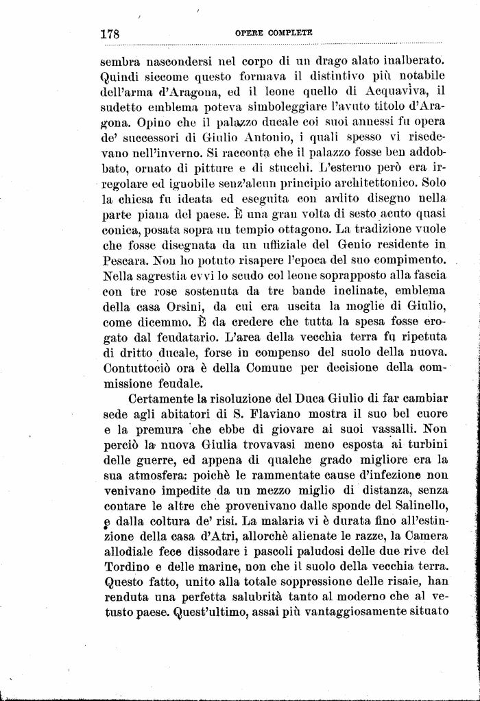 sembra nascondersi nel corpo di un drago alato inalberato. Quindi siccome questo formava il distintivo più notabile dell'arma d'Aragoua, ed il leone quello di Acquaviva, il sudetto emblema poteva simboleggiare l'avuto titolo d'Ara-gona. Opino che il palazzo ducale coi suoi annessi fu opera de' successori di Giulio Antonio, i quali spesso vi risedevano nell'inverno. Si racconta che il palazzo fosse ben addobbato, ornato di pitture e di stucchi. L'esterno però era irregolare ed ignobile seuz'alcun principio architettonico. Solo la chiesa fu ideata ed eseguita con ardito disegno nella parte piana del paese. È una gran volta di sesto acuto quasi conica, posata sopra un tempio ottagono. La tradizione vuole che fosse disegnata da un uflìziale del Genio residente in Pescara. Non ho potuto risapere l'epoca del suo compimento. Nella sagrestia evvi lo scudo col leone soprapposto alla fascia con tre rose sostenuta da tre bande inclinate, emblema della casa Orsini, da cui era uscita la moglie di Giulio, come dicemmo. È da credere che tutta la spesa fosse erogato dal feudatario. L'area della vecchia terra fu ripetuta di dritto ducale, forse in compenso del suolo della nuova. Oontuttociò ora è della Comune per decisione della commissione feudale.