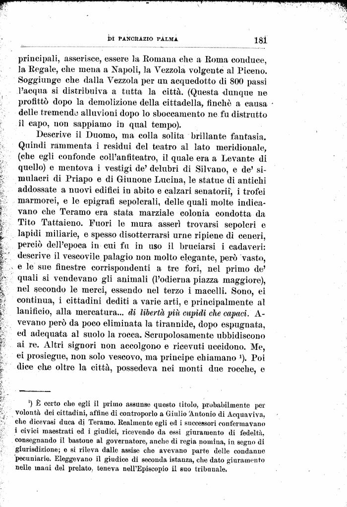 Descrive il Duomo, ma colla solita brillante fantasia. Quindi rammenta i residui del teatro al lato meridionale, (che egli confonde coll'anfiteatro, il quale era a Levante di quello) e mentova i vestigi de' delubri di Silvano, e de' simulacri di Priapo e di Giunone Lucina, le statue di antichi addossate a nuovi edifici in abito e calzari senatorii, i trofei marmorei, e le epigrafi sepolcrali, delle quali molte indicavano che Teramo era stata marziale colonia condotta da Tito Tattaieno. Fuori le mura asserì trovarsi sepolcri e lapidi miliario, e spesso disotterrarsi urne ripiene di ceneri, perciò dell'epoca in cui fu in uso il bruciarsi i cadaveri: descrive il vescovile palagio non molto elegante, però vasto, e le sue finestre corrispondenti a tre fori, nel primo de' quali si vendevano gli animali (l'odierna piazza maggiore), nel secondo le merci, essendo nel terzo i macelli. Sono, ei continua, i cittadini dediti a varie arti, e principalmente al lanificio, alla mercatura... di libertà più cupidi che capaci. A-vevano però da poco eliminata la tirarinide, dopo espugnata, ed adequata al suolo la rocca. Scrupolosamente ubbidiscono ai re. Altri signori non accolgono e ricevuti uccidono. Me, ei prosiegue, non solo vescovo, ma principe chiamano J). Poi dice che oltre la città, possedeva nei monti due rocche, e