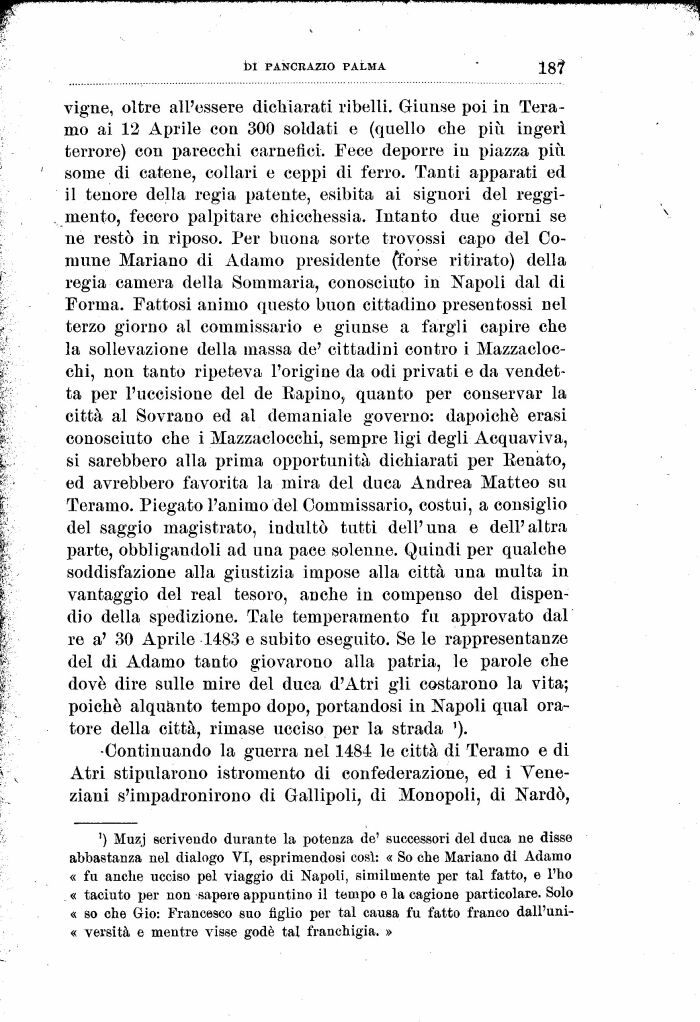 vigne, oltre all'essere dichiarati ribelli. Giunse poi in Tera-mo ai 12 Aprile con 300 soldati e (quello che più ingerì terrore) con parecchi carnefici. Fece deporre in piazza più some di catene, collari e ceppi di ferro. Tanti apparati ed il tenore della regia patente, esibita ai signori del reggimento, fecero palpitare chicchessia. Intanto due giorni se ne restò in riposo. Per buona sorte trovossi capo del Comune Mariano di Adamo presidente (forse ritirato) della regia camera della Sommaria, conosciuto in Napoli dal di Forma. Fattosi animo questo buon cittadino presentossi nel terzo giorno al commissario e giunse a fargli capire che la sollevazione della massa de' cittadini contro i Mazzacloc-chi, non tanto ripeteva l'origine da odi privati e da vendetta per l'uccisione del de Rapino, quanto per conservar la città al Sovrano ed al demaniale governo: dapoichè erasi conosciuto che i Mazzaclocchi, sempre ligi degli Acquaviva, si sarebbero alla prima opportunità dichiarati per Eenàto, ed avrebbero favorita la mira del duca Andrea Matteo su Teramo. Piegato l'animo del Commissario, costui, a consiglio del saggio magistrato, indulto tutti dell'una e dell'altra parte, obbligandoli ad una pace solenne. Quindi per qualche soddisfazione alla giustizia impose alla città una multa in vantaggio del real tesoro, anche in compenso del dispendio della spedizione. Tale temperamento fu approvato dal re a' 30 Aprile 1483 e subito eseguito. Se le rappresentanze del di Adamo tanto giovarono alla patria, le parole che dovè dire sulle mire del duca d'Atri gli costarono la vita; poiché alquanto tempo dopo, portandosi in Napoli qual oratore della città, rimase ucciso per la strada ').