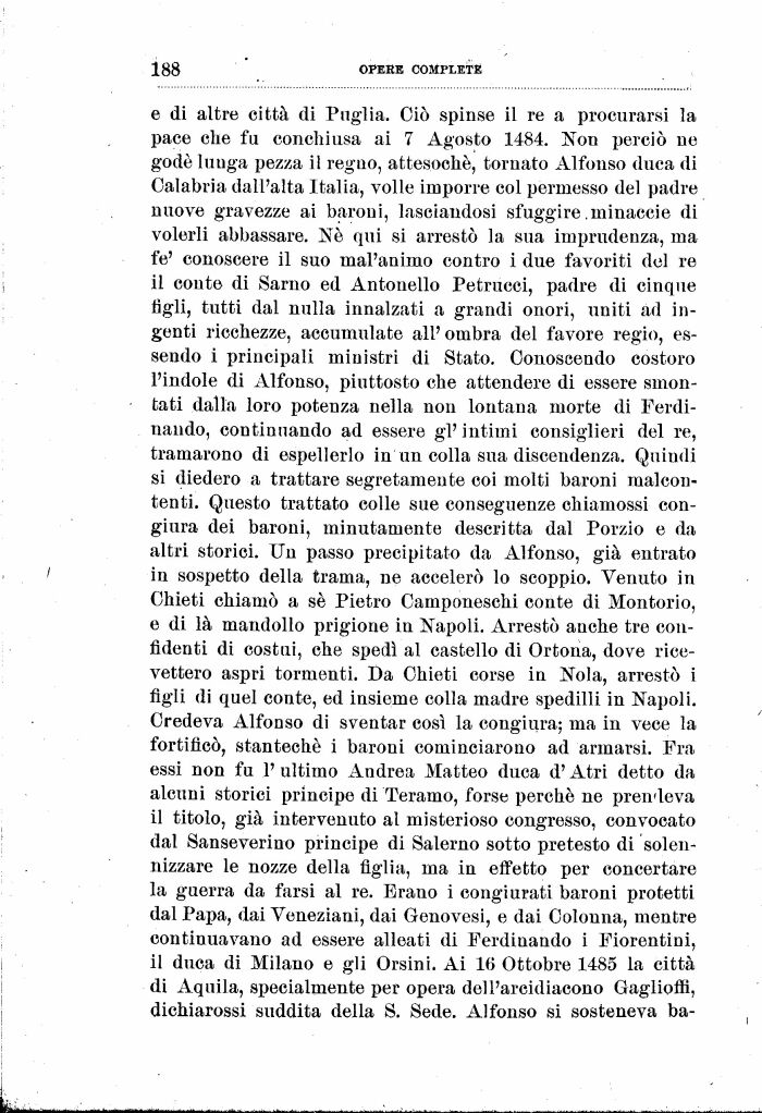 e di altre città di Puglia. Ciò spinse il re a procurarsi la pace che fu conchiusa ai 7 Agosto 1484. Non perciò ne godè lunga pezza il regno, attesoché, tornato Alfonso duca di Calabria dall'alta Italia, volle imporre col permesso del padre nuove gravezze ai baroni, lasciandosi sfuggire.minacele di volerli abbassare. Né qui si arrestò la sua imprudenza, ma fé' conoscere il suo mal'animo contro i due favoriti del re il conte di Sarno ed Antonello Petrucci, padre di cinque figli, tutti dal nulla innalzati a grandi onori, uniti ad ingenti ricchezze, accumulate ali' ombra del favore regio, essendo i principali ministri di Stato. Conoscendo costoro l'indole di Alfonso, piuttosto che attendere di essere smontati dalla loro potenza nella non lontana morte di Ferdi-nando, continuando ad essere gì' intimi consiglieri del re, tramarono di espellerlo in un colla sua discendenza. Quindi si diedero a trattare segretamente coi molti baroni malcontenti. Questo trattato colle sue conseguenze chiamossi congiura dei baroni, minutamente descritta dal Porzio e da altri storici. Un passo precipitato da Alfonso, già entrato in sospetto della trama, ne accelerò lo scoppio. Venuto in Chieti chiamò a sé Pietro Camponeschi conte di Montorio, e di là mandollo prigione in Napoli. Arrestò anche tre confidenti di costui, che spedì al castello di Ortona, dove ricevettero aspri tormenti. Da Chieti corse in Noia, arrestò i figli di quel conte, ed insieme colla madre spedilli in Napoli. Credeva Alfonso di sventar così la congiura; ma in vece la fortificò, stantechè i baroni cominciarono ad armarsi. Fra essi non fu 1' ultimo Andrea Matteo duca d'Atri detto da alcuni storici principe di Teramo, forse perché ne prendeva il titolo, già intervenuto al misterioso congresso, convocato dal Sanseverino principe di Salerno sotto pretesto di solennizzare le nozze della figlia, ma in effetto per concertare la guerra da farsi al re. Brano i congiurati baroni protetti dal Papa, dai Veneziani, dai Genovesi, e dai Colonna, mentre continuavano ad essere alleati di Ferdinando i Fiorentini, il duca di Milano e gli Orsini. Ai 16 Ottobre 1485 la città di Aquila, specialmente per opera dell'arcidiacono Gaglioffi, dichiarossi suddita della S. Sede. Alfonso si sosteneva ba-