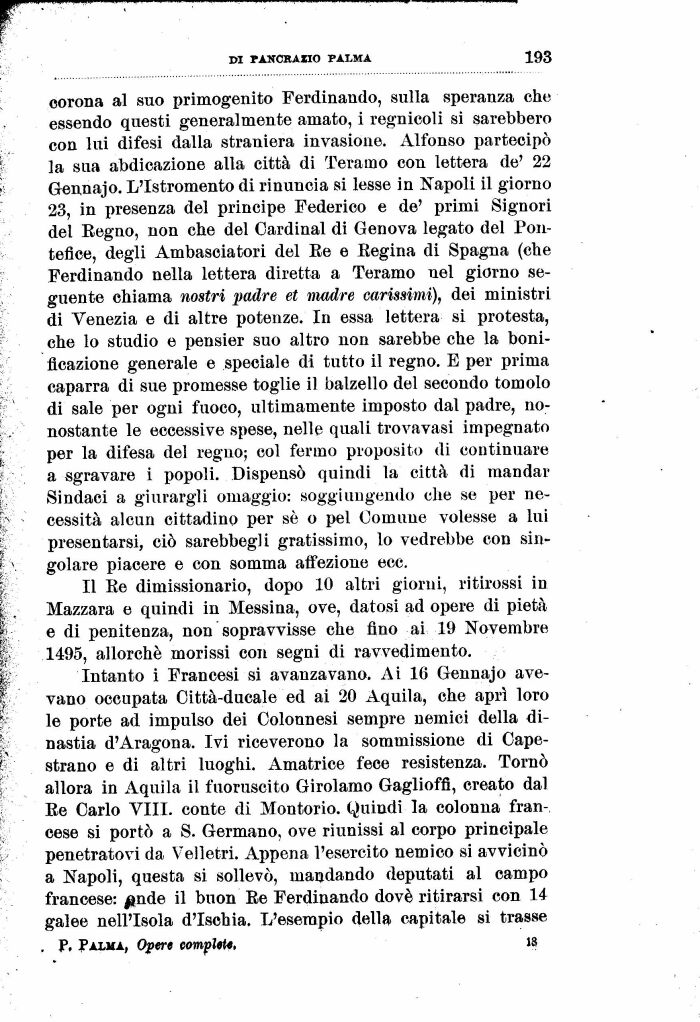 corona al suo primogenito Ferdinando, sulla speranza che essendo questi generalmente amato, i regnicoli si sarebbero con lui difesi dalla straniera invasione. Alfonso partecipò la sua abdicazione alla città di Teramo con lettera de' 22 Gennajo. L'Istromento di rinuncia si lesse in Napoli il giorno 23, in presenza del principe Federico e de' primi Signori del Regno, non che del Cardinal di Genova legato del Pontefice, degli Ambasciatori del Ee e Eegina di Spagna (che Ferdinando nella lettera diretta a Teramo nel giorno seguente chiama nostri padre et madre carissimi), dei ministri di Venezia e di altre potenze. In essa lettera si protesta, che lo studio e pensier suo altro non sarebbe che la bonificazione generale e speciale di tutto il regno. E per prima caparra di sue promesse toglie il balzello del secondo tomolo di sale per ogni fuoco, ultimamente imposto dal padre, nonostante le eccessive spese, nelle quali trovavasi impegnato per la difesa del regno; col ferino proposito di continuare a sgravare i popoli. Dispensò quindi la città di mandar Sindaci a giurargli omaggio: soggiungendo che se per necessità alcun cittadino per sé o pel Comune volesse a lui presentarsi, ciò sarebbegli gratissimo, lo vedrebbe con singolare piacere e con somma affezione ecc.