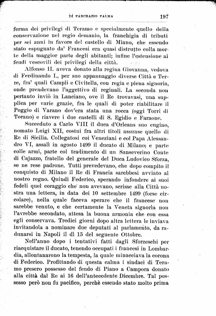 Nell'anno dopo i tentativi fatti dagli Sforzeschi per riacquistare il ducato, tenendo occupati i francesi in Lombardia, allontanarono la tempesta, la quale minacciava la corona di Federico. Profittando di questa calma i sindaci di Tera-mo presero possesso del feudo di Piano a Campora donato alla città dal Ee ai 16 dell'antecedente Dicembre. Tal possesso però non fu pacifico, perché essendo stato molto prima
