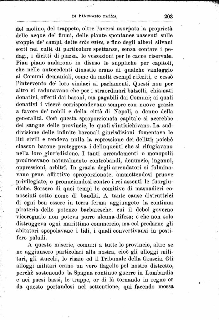 del molino, del trappeto, oltre l'aversi usurpata la proprietà delle acque de' fiumi, delle piante spontanee nascenti sulle stoppie de' campi, dette erbe estive, e fino degli alberi silvani sorti nei culti di particolare spettanze, senza contare i pe-dagi, i diritti di piazza, le vessazioni per le cacce riservate. Pian piano andarono in disuso le suppliche per capitoli, che nelle antecedenti dinastie erano di qualche vantaggio ai Comuni demaniali, come da molti esempì riferiti, e cessò l'intervento de' loro sindaci ai parlamenti. Questi non per altro si radunavano che per i straordinarì balzelli, chiamati donativi, offerti dai baroni, ma pagabili dai Comuni; ai quali donativi i viceré corrispondevano sempre con nuove grazie a favore de' nobili e della città di Napoli, a danno della generalità. Così questa sproporzionata capitale si accrebbe del sangue delle provincie, le quali s'intisichivano. La suddivisione delle infinite baronali giurisdizioni fomentava le liti civili e rendeva nulla la repressione dei delitti; poiché ciascun barone proteggeva i delinquenti che si rifugiavano nella loro giurisdizione. I tanti arrendamenti o monopolii producevano naturalmente controbandi, denuncio, inganni, oppressioni, arbitri. In grazia degli arrendatori si fulminavano pene afflittive sproporzionate, ammettendosi pruove privilegiate, e pronuciandosi contro i rei assenti le fuorgiu-diche. Sorsero di quei tempi le comitive di masnadieri conosciuti sotto nome di banditi. A tante cause distrattaci di ogni ben essere in terra ferma aggiungete la continua pirateria delle potenze barbaresche, cui il debol governo viceregnale non poteva porre alcuna difesa; e che non solo distruggeva ogni marittimo commercio, ma col predarne gli abitatori spopolavane i lidi, i quali convertivansi in pestifere paludi.