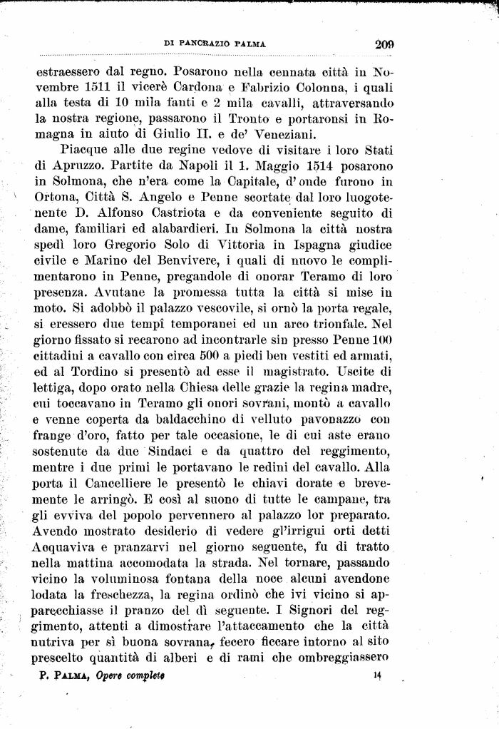 Piacque alle due regine vedove di visitare i loro Stati di Apruzzo. Partite da Napoli il 1. Maggio 1514 posarono in Solmona, che n'era come la Capitale, d'onde furono in Ortona, Città S. Angelo e Penne scortate dal loro luogotenente D. Alfonso Castriota e da conveniente seguito di dame, familiari ed alabardieri. In Solmona la città nostra spedì loro Gregorio Solo di Vittoria in Ispagna giudice civile e Marino del Benvivere, i quali di nuovo le complimentarono in Penne, pregandole di onorar Teramo di loro presenza. Avutane la promessa tutta la città si mise in moto. Si adobbò il palazzo vescovile, si ornò la porta regale, si eressero due tempi temporanei ed un arco trionfale. Nel giorno fissato si recarono ad incontrarle sin presso Penne 100 cittadini a cavallo con circa 500 a piedi beri vestiti ed armati, ed al lordino si presentò ad esse il magistrato. Uscite di lettiga, dopo orato nella Chiesa delle grazie la regina madre, cui toccavano in Teramo gli onori sovrani, montò a cavallo e venne coperta da baldacchino di velluto pavonazzo con frange d'oro, fatto per tale occasione, le di cui aste erano sostenute da due Sindaci e da quattro del reggimento, mentre i due primi le portavano le redini del cavallo. Alla porta il Cancelliere le presentò le chiavi dorate e brevemente le arringò. E così al snono di tutte le campane, tra gli evviva del popolo pervennero al palazzo lor preparato. Avendo mostrato desiderio di vedere gl'irrigui orti detti Aoquaviva e pranzarvi nel giorno seguente, fu di tratto nella mattina accomodata la strada. Nel tornare, passando vicino la voluminosa fontana della noce alcuni avendone lodata la freschezza, la regina ordinò che ivi vicino si apparecchiasse il pranzo del dì seguente. I Signori del reggimento, attenti a dimostrare l'attaccamento che la città nutriva per sì buona sovrana^ fecero ficcare intorno al sito prescelto quantità di alberi e di rami che ombreggiassero P. PALMA, Opere complete 14