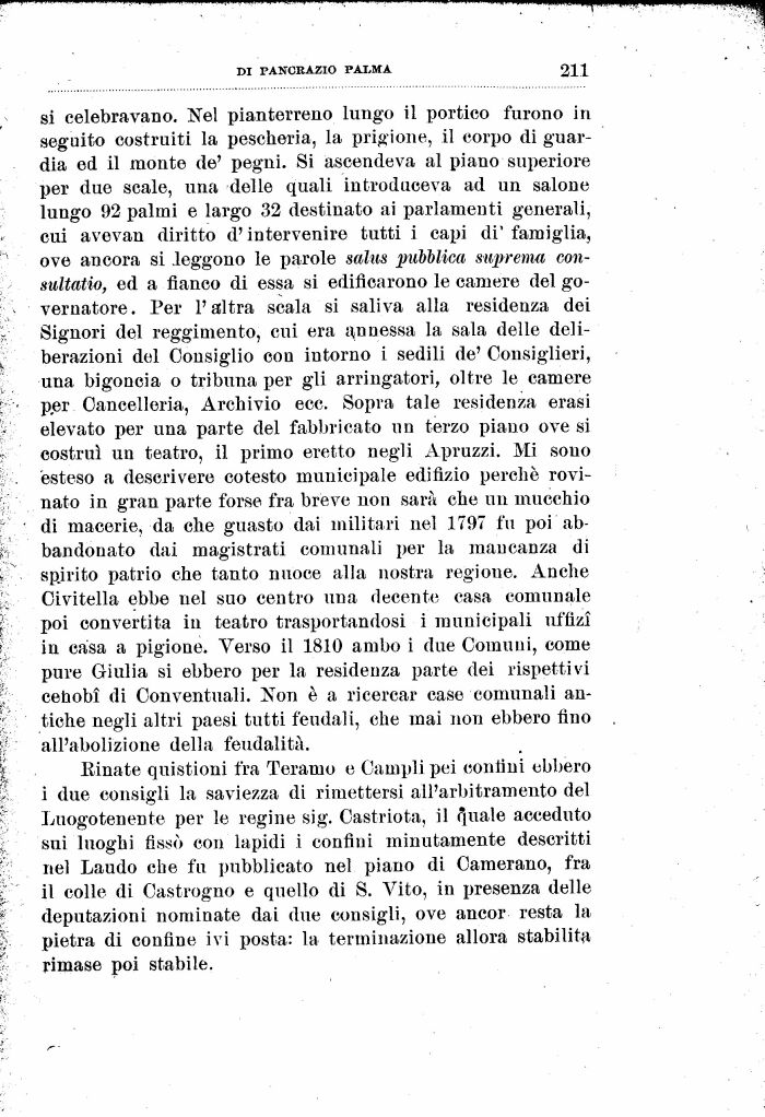 si celebravano. Nel pianterreno lungo il portico furono in seguito costruiti la pescheria, la prigione, il corpo di guardia ed il monte de' pegni. Si ascendeva al piano superiore per due scale, una delle quali introduceva ad un salone lungo 92 palmi e largo 32 destinato ai parlamenti generali, cui avevan diritto d'intervenire tutti i capi di' famiglia, ove ancora si .leggono le parole salus pubblica suprema con-sultatio, ed a fianco di essa si edificarono le camere del governatore. Per l'altra scala si saliva alla residenza dei Signori del reggimento, cui era Annessa la sala delle deliberazioni del Consiglio con intorno i sedili de' Consiglieri, una bigoncia o tribuna per gli arringato™, oltre le camere per Cancelleria, Archivio ecc. Sopra tale residenza erasi elevato per una parte del fabbricato un terzo piano ove si costruì un teatro, il primo eretto negli Apruzzi. Mi sono esteso a descrivere cotesto municipale edifizio perché rovinato in gran parte forse fra breve non sarà che un mucchio di macerie, da che guasto dai militari nel 1797 fu poi abbandonato dai magistrati comunali per la mancanza di spjrito patrio che tanto nuoce alla nostra regione. Anche Civitella ebbe nel suo centro una decente casa comunale poi convertita in teatro trasportandosi i municipali uffizi in casa a pigione. Verso il 1810 ambo i due Comimi, come pure Giulia si ebbero per la residenza parte dei rispettivi cehobì di Conventuali. Non è a ricercar case comunali antiche negli altri paesi tutti feudali, che mai non ebbero fino all'abolizione della feudalità.