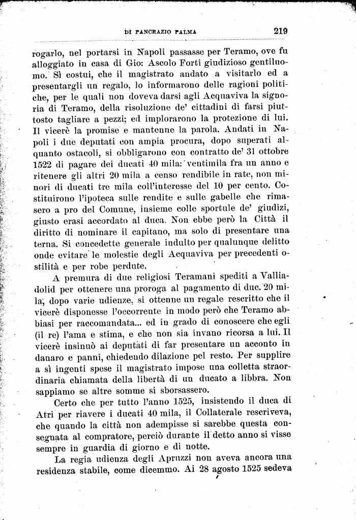 rogarlo, nel portarsi in Napoli passasse per Teramo, ove fu alloggiato in casa di Gio: Ascolo Forti giudizioso gentiluomo. Sì costui, che il magistrato andato a visitarlo ed a presentargli un regalo, lo informarono delle ragioni politiche, per le quali non doveva darsi agli Acqua viva la signoria di Teramo, della risoluzione de' cittadini di farsi piuttosto tagliare a pezzi; ed implorarono la protezione di lui. Il viceré la promise e mantenne la parola. Andati in Napoli i due deputati con ampia procura, dopo superati alquanto ostacoli, si obbligarono con contratto de' 31 ottobre 1522 di pagare dei ducati 40 mila:'ventimila fra un anno e ritenere gli altri 20 mila a censo rendibile in rate, non minori di ducati tre mila coll'interesse del 10 per cento. Costituirono l'ipoteca sulle rendite e sulle gabelle che rimasero a prò del Comune, insieme colle sportule de' giudizi, giusto erasi accordato al duca. Non ebbe però la Città il diritto di nominare il capitano, ma solo di presentare una terna. Si concedette generale indulto per qualunque delitto onde evitare le molestie degli Acquaviva per precedenti o-stilità e per robe perdute.