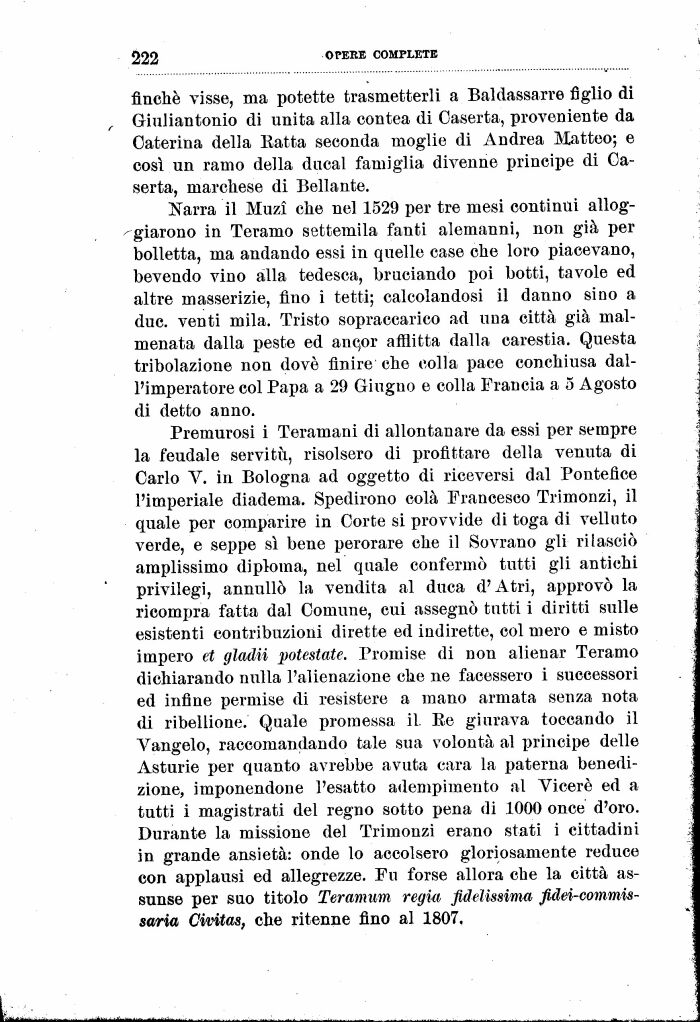 Premurosi i Teramani di allontanare da essi per sempre la feudale servitù, risolsero di profittare della venuta di Carlo V. in Bologna ad oggetto di riceversi dal Pontefice l'imperiale diadema. Spedirono colà Francesco Trimonzi, il quale per comparire in Corte si provvide di toga di velluto verde, e seppe sì bene perorare che il Sovrano gli rilasciò amplissimo diploma, nel quale confermò tutti gli antichi privilegi, annullò la vendita al duca d'Atri, approvò la ricompra fatta dal Comune, cui assegnò tutti i diritti sulle esistenti contribuzioni dirette ed indirette, col mero e misto impero et gladii potestate. Promise di non alienar Teramo dichiarando nulla l'alienazione che ne facessero i successori ed infine permise di resistere a mano armata senza nota di ribellione. Quale promessa il. Ee giurava toccando il Vangelo, raccomandando tale sua volontà al principe delle Asturie per quanto avrebbe avuta cara la paterna benedizione, imponendone l'esatto adempimento al Viceré ed a tutti i magistrati del regno sotto pena di 1000 once d'oro. Durante la missione del Trimonzi erano stati i cittadini in grande ansietà: onde lo accolsero gloriosamente reduce con applausi ed allegrezze. Fu forse allora che la città assunse per suo titolo Teramum regia ^delissima, fldei-commis-saria Cwitas, che ritenne fino al 1807.