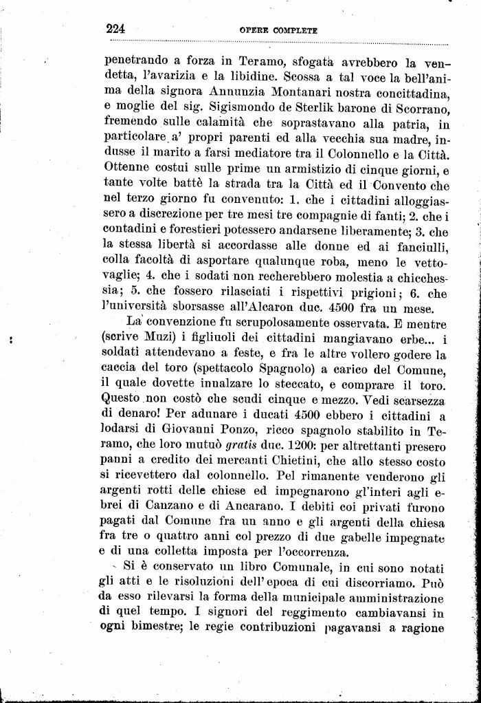 penetrando a forza in Teramo, sfogata avrebbero la vendetta, l'avarizia e la libidine. Scossa a tal voce la bell'anima della signora Annunzia Montanari nostra concittadina, e moglie del sig. Sigismondo de Sterlik barone di Scorrano, fremendo sulle calamità che soprastavano alla patria, in particolare a' propri parenti ed alla vecchia sua madre, indusse il marito a farsi mediatore tra il Colonnello e la Città. Ottenne costui sulle prime un armistizio di cinque giorni, e tante volte battè la strada tra la Città ed il Convento che nel terzo giorno fu convenuto: 1. che i cittadini alloggiassero a discrezione per tre mesi tre compagnie di fanti; 2. che i contadini e forestieri potessero andarsene liberamente; 3. che la stessa libertà si accordasse alle donne ed ai fanciulli, colla facoltà di asportare qualunque roba, meno le vettovaglie; 4. che i sodati non recherebbero molestia a chicchessia ; 5. che fossero rilasciati i rispettivi prigioni ; 6. che l'università sborsasse all'Alcaron due. 4500 fra un mese.