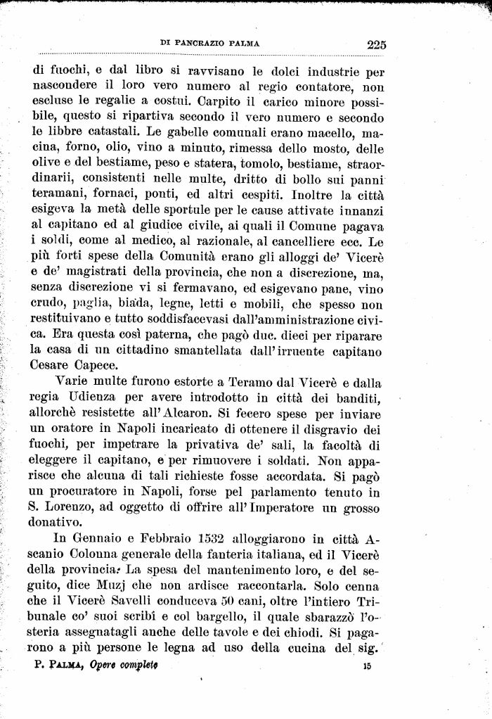 In Gennaio e Febbraio 1532 alloggiarono in città A-scanio Colonna generale della fanteria italiana, ed il Viceré della provincia.- La spesa del mantenimento loro, e del seguito, dice Muzj che non ardisce raccontarla. Solo cenna che il Viceré Savelli conduceva 50 cani, oltre l'intiero Tribunale co' suoi scribi e col bargello, il quale sbarazzò l'osteria assegnatagli anche delle tavole e dei chiodi. Si pagarono a più persone le legna ad uso della cucina del sig. P. PALMA, Opere completf 15