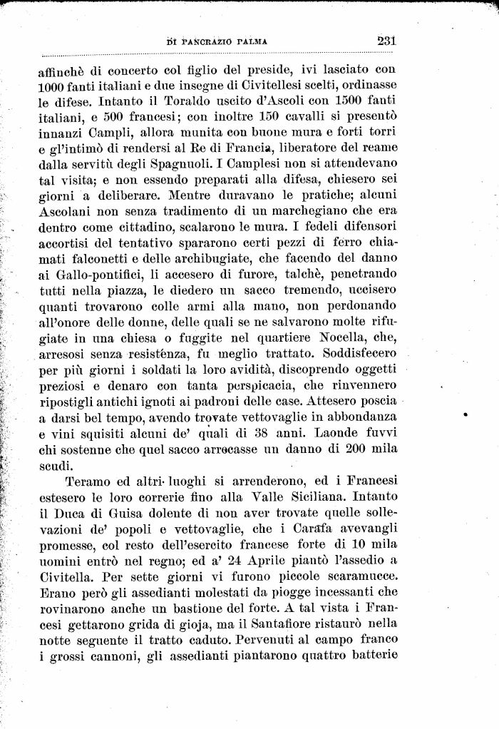 affinchè di concerto col figlio del preside, ivi lasciato con 1000 fanti italiani e due insegne di Civitellesi scelti, ordinasse le difese. Intanto il Toraldo uscito d'Ascoli con 1500 fanti italiani, e 500 francesi; con inoltre 150 cavalli si presentò innanzi Campii, allora munita con buone mura e forti torri e gl'intimo di rendersi al Re di Francia, liberatore del reame dalla servitù degli Spagnuoli. I Oamplesi non si attendevano tal visita; e non essendo preparati alla difesa, chiesero sei giorni a deliberare. Mentre duravano le pratiche; alcuni Ascolani non senza tradimento di un marchegiano che era dentro come cittadino, scalarono le mura. I fedeli difensori accortisi del tentativo spararono certi pezzi di ferro chiamati falconetti e delle archibugiate, che facendo del danno ai Gallo-pontiflci, li accesero di furore, talché, penetrando tutti nella piazza, le diedero un sacco tremendo, uccisero quanti trovarono colle armi alla mano, non perdonando all'onore delle donne, delle quali se ne salvarono molte rifugiate in una chiesa o fuggite nel quartiere Nocella, che, arresosi senza resistènza, fu meglio trattato. Soddisfecero per più giorni i soldati la loro avidità, discoprendo oggetti preziosi e denaro con tanta perspicacia, che rinvennero ripostigli antichi ignoti ai padroni delle case. Attesero poscia a darsi bel tempo, avendo trovate vettovaglie in abbondanza e vini squisiti alcuni de' quali di 38 anni. Laonde fuvvi chi sostenne che quel sacco arrecasse un danno di 200 mila scudi.