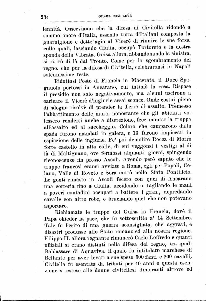 lennità. Osserviamo che la difesa di Civitella ridondò a sommo onore d'Italia, essendo tutta d'Italiani composta la guarnigione e dette'agio al Viceré di riunire le sue forze, colle quali, lasciando Giulia, occupò Tortoreto e la destra sponda della Vibrata. Guisa allora, abbandonando la sinistra, si ritirò di là dal Tronto. Come per lo sgombramente del regno, che per la difesa di Civitella, celebraronsi in Napoli solennissime teste.