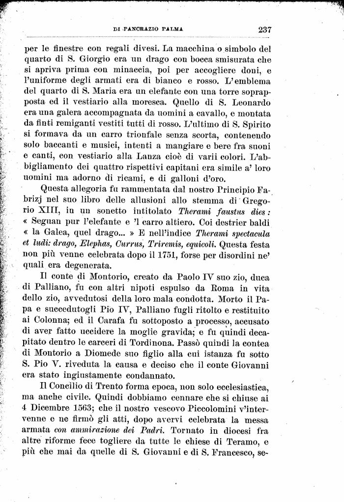 Questa allegoria fu rammentata dal nostro Principio Pa-brizj nel suo libro delle allusioni allo stemma di Grego-rio XIII, in un sonetto intitolato Therami faustus dies : « Seguan pur l'elefante e '1 carro altiero. Coi destrier baldi « la Galea, quel drago... » E nell'indice Therami spectacula et ludi: drago, ElepJias, Currus, Triremis, equivali. Questa festa non più venne celebrata dopo il 1751, forse per disordini ne' quali era degenerata.