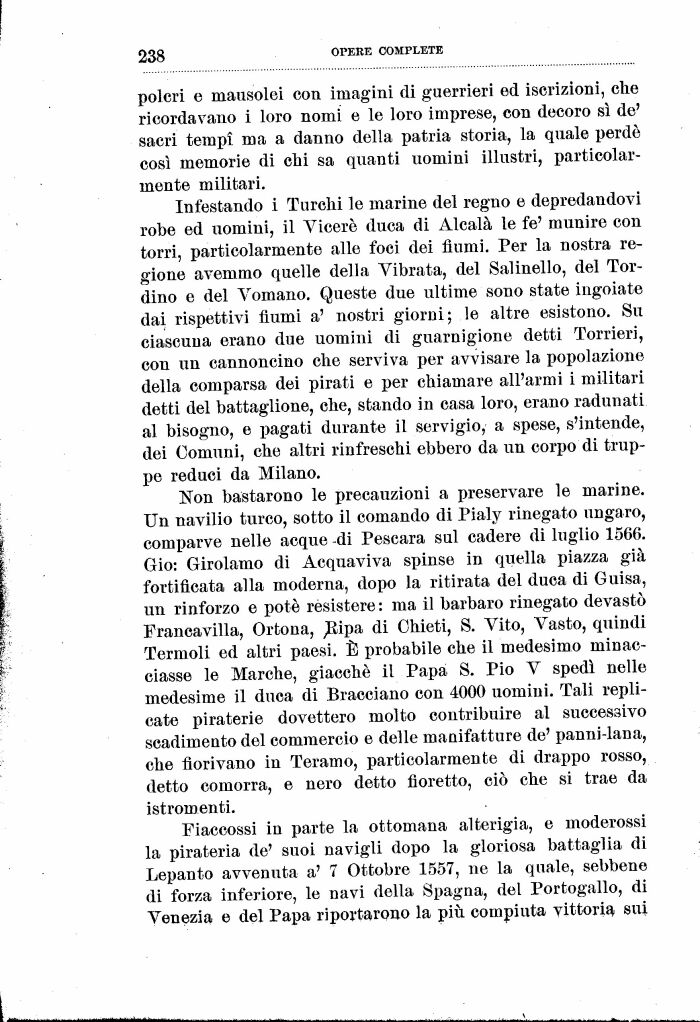 Non bastarono le precauzioni a preservare le marine. Un navilio turco, sotto il comando di Pialy rinegato ungaro, comparve nelle acque -di Pescara sul cadere di luglio 1566. Gio: Girolamo di Acquaviva spinse in quella piazza già fortificata alla moderna, dopo la ritirata del duca di Guisa, un rinforzo e potè resistere : ma il barbaro rinegato devastò Francavilla, Ortona, ^Kipa di Chieti, S. Vito, Vasto, quindi Termoli ed altri paesi. È probabile che il medesimo minacciasse le Marche, giacché il Papa 8. Pio V spedì nelle medesime il duca di Bracciano con 4000 uomini. Tali replicate piraterie dovettero molto contribuire al successivo scadimento del commercio e delle manifatture de' panni-lana, che fiorivano in Teramo, particolarmente di drappo rosso, detto comorra, e nero detto fioretto, ciò che si trae da istromenti.