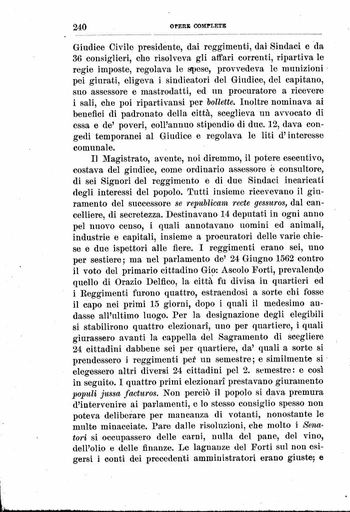 Il Magistrato, avente, noi diremmo, il potere esecutivo, costava del giudice, come ordinario assessore e consultore, di sei Signori del reggimento e di due Sindaci incaricati degli interessi del popolo. Tutti insieme ricevevano il giuramento del successore se republicam recte gessuros, dal cancelliere, di secretezza. Destinavano 14 deputati in ogni anno pel nuovo censo, i quali annotavano uomini ed animali, industrie e capitali, insieme a procuratori delle varie chiese e due ispettori alle fiere. I reggimenti erano sei, uno per sestiere ; ma nel parlamento de' 24 Giugno 1562 contro il voto del primario cittadino Gio: Ascolo Forti, prevalendo quello di Grazio Delfico, la città fu divisa in quartieri ed i Eeggimenti furono quattro, estraendosi a sorte chi fosse il capo nei primi 15 giorni, dopo i quali il medesimo andasse all'ultimo luogo. Per la designazione degli elegibili si stabilirono quattro elezionarì, uno per quartiere, i quali giurassero avanti la cappella del Sagramento di scegliere 24 cittadini dabbene sei per quartiere, da' quali a sorte si prendessero i reggimenti pef un semestre; e similmente si elegessero altri diversi 24 cittadini pel 2. semestre: e così in seguito. I quattro primi elezionarì prestavano giuramento populi jussa facturos. Non perciò il popolo si dava premura d'intervenire ai parlamenti, e lo stesso consiglio spesso non poteva deliberare per mancanza di votanti, nonostante le multe minacciate. Pare dalle risoluzioni, che molto i Senatori si occupassero delle carni, nulla del pane, del vino, dell'olio e delle finanze. Le lagnanze del Forti sul non esigersi i conti dei precedenti amministratori erano giuste; e