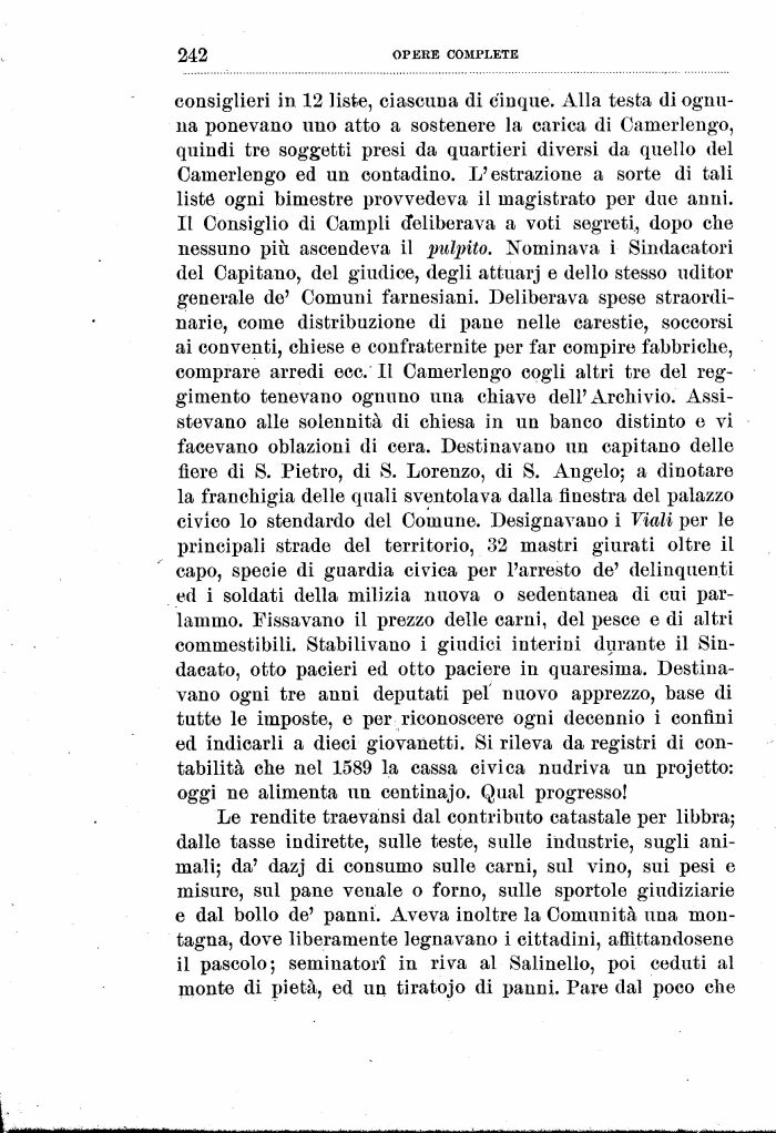 consiglieri in 12 liste, ciascuna di cinque. Alla testa di ognuna ponevano uno atto a sostenere la carica di Camerlengo, quindi tre soggetti presi da quartieri diversi da quello del Camerlengo ed un contadino. L'estrazione a sorte di tali liste ogni bimestre provvedeva il magistrato per due anni. Il Consiglio di Campii deliberava a voti segreti, dopo che nessuno più. ascendeva il pulpito. Nominava i Sindacatori del Capitano, del giudice, degli attuarj e dello stesso uditor generale de' Comuni farnesi ani. Deliberava spese straordinarie, come distribuzione di pane nelle carestie, soccorsi ai conventi, chiese e confraternite per far compire fabbriche, comprare arredi ecc. Il Camerlengo cogli altri tre del reggimento tenevano ognuno una chiave dell'Archivio. Assistevano alle solennità di chiesa in un banco distinto e vi facevano oblazioni di cera. Destinavano un capitano delle fiere di 8. Pietro, di S. Lorenzo, di S. Angelo; a dinotare la franchigia delle quali sventolava dalla finestra del palazzo civico lo stendardo del Comune. Designavano i Viali per le principali strade del territorio, 32 mastri giurati oltre il capo, specie di guardia civica per l'arresto de' delinquenti ed i soldati della milizia nuova o sedentanea di cui parlammo. Fissavano il prezzo delle carni, del pesce e di altri commestibili. Stabilivano i giudici interini durante il Sindacato, otto pacieri ed otto paciere in quaresima. Destinavano ogni tre anni deputati pel nuovo apprezzo, base di tutte le imposte, e per riconoscere ogni decennio i confini ed indicarli a dieci giovanetti. Si rileva da registri di contabilità che nel 1589 la cassa civica nudriva un projetto: oggi ne alimenta un centinajo. Qual progresso!
