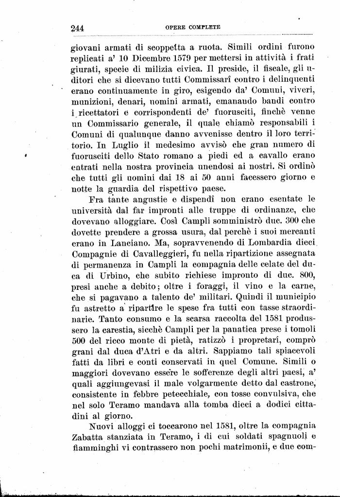 Fra tante angustie e dispendi non erano esentate le università dal far impronti alle truppe di ordinanze, che dovevano alloggiare. Così Campii somministrò due. 300 che dovette prendere a grossa usura, dal perché i suoi mercanti erano in Lanciano. Ma, sopravvenendo di Lombardia dieci Compagnie di Cavalleggieri, fu nella ripartizione assegnata di permanenza in Campii la compagnia delle celate del duca di Urbino, che subito richiese impronto di due. 800, presi anche a debito; oltre i foraggi, il vino e la carne, che si pagavano a talento de' militari. Quindi il municipio fu astretto a ripartire le spese fra tutti con tasse straordinarie. Tanto consumo e la scarsa raccolta del 1581 produssero la carestia, sicché Campii per la panatica prese i tomoli 500 del ricco monte di pietà, ratizzò i propretari, comprò grani dal duca d'Atri e da altri. Sappiamo tali spiacevoli fatti da libri e conti conservati in quel Comune. Simili o maggiori dovevano esse're le sofferenze degli altri paesi, a' quali aggiungeva»! il male volgarmente detto dal castrone, consistente in febbre petecchiale, con tosse convulsiva, che nel solo Teramo mandava alla tomba dieci a dodici cittadini al giorno.