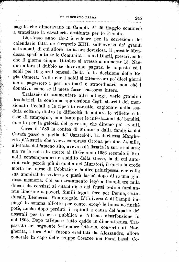 Circa il 1585 la contea di Montorio dalla famiglia dei Carafa passò a quella de' Caraccioli. La duchessa Margherita d'Austria che aveva comprato Ortoua per due. 54 mila, allettata dall'ameno sito, aveva colà fissata la sua residenza; ma ve la colse la morte ai 18 Gennaio 1586 secondo il Brunetti contemporaneo e suddito della stessa, la di- cui autorità vale perciò più di quella del Muratori, il quale la crede morta nel mese di Febbraio e la dice principessa, che colla sua ammirabile saviezza e pietà lasciò dopo di so una gloriosa memoria. Col suo testamento legò a Campii tre mila ducati da censirsi ai cittadini; e dei frutti ordinò farsi annue limosino a poveri. Simili legati fece per Penne, Città-ducale, Leonessa, Monteregale. L'Università di Campii impiegò la somma all'otto per cento, erogò le limosine finché potè, anche dopo perduti i capitali a causa dell'apatia de' nostrali per la cosa pubblica e l'ultima distribuzione fu nel 1803. Dopo tal'epoca tutto cadde in dimenticanza. Trapassato nel seguente Settembre Ottavio, consorte di Margherita, i loro Stati furono ereditati da Alessandro, allora generale in capo delle truppe Cesaree nei Paesi bassi. Co-