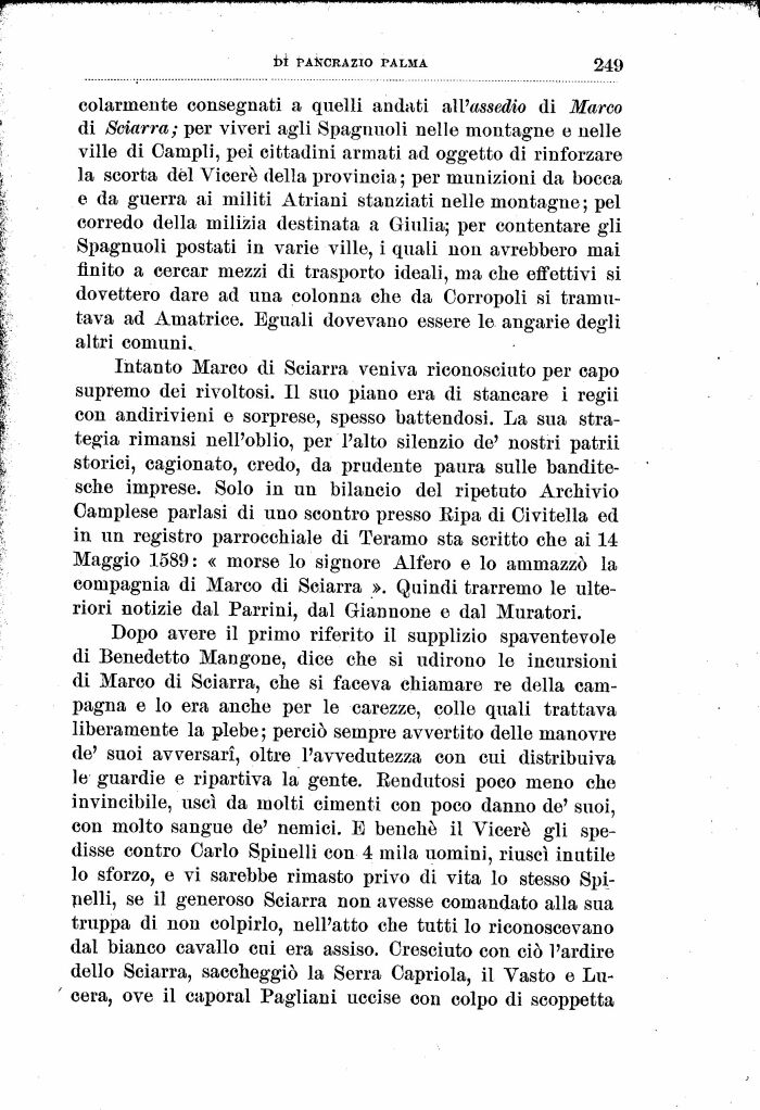 Dopo avere il primo riferito il supplizio spaventevole di Benedetto Mangone, dice che si udirono le incursioni di Marco di Sciarra, che si faceva chiamare re della campagna e lo era anche per le carezze, colle quali trattava liberamente la plebe ; perciò sempre avvertito delle manovre de' suoi avversar!, oltre l'avvedutezza con cui distribuiva le guardie e ripartiva la gente. Bendutosi poco meno che invincibile, uscì da molti cimenti con poco danno de' suoi, con molto sangue de' nemici. E benché il Viceré gli spedisse contro Carlo Spinelli con 4 mila uomini, riuscì inutile lo sforzo, e vi sarebbe rimasto privo di vita lo stesso Spinelli, se il generoso Sciarra non avesse comandato alla sua truppa di non colpirlo, nell'atto che tutti lo riconoscevano dal bianco cavallo cui era assiso. Cresciuto con ciò l'ardire dello Sciarra, saccheggiò la Serra Capriola, il Vasto e Lu-cera, ove il caperai Pagliani uccise con colpo di scoppetta