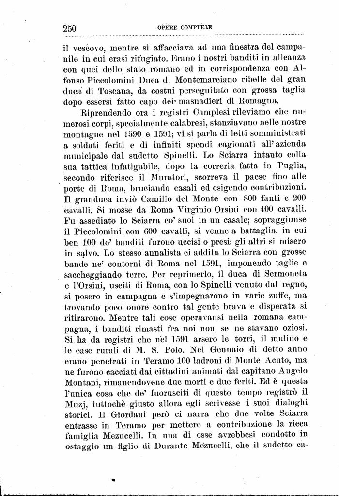 Eiprendendo ora i registri Oamplesi rileviamo che numerosi corpi, specialmente calabresi, stanziavano nelle nostre montagne nel 1590 e 1591; vi si parla di letti somministrati a soldati feriti e di infiniti spendi cagionati all'azienda municipale dal sudetto Spinelli. Lo Sciarra intanto colla, sua tattica infatigabile, dopo la correria fatta in Puglia, secondo riferisce il Muratori, scorreva il paese fino alle porte di Eorna, bruciando casali ed esigendo contribuzioni. Il granduca inviò Oamillo del Monte con 800 fanti e 200 cavalli. Sì mosse da Eoma Virginio Orsini con 400 cavalli. Fu assediato lo Sciarra co' suoi in un casale; sopraggiunse il Piccolomini con 600 cavalli, si venne a battaglia, in cui ben 100 de' banditi furono uccisi o presi: gli altri si misero in salvo. Lo stesso annalista ci addita lo Sciarra con grosse bande ne' contorni di Eoma nel 1591, imponendo taglie e saccheggiando terre. Per reprimerlo, il duca di Sermoneta e l'Orsini, usciti di Eoma, con lo Spinelli venuto dal regno, si posero in campagna e s'impegnarono in varie zuffe, ma trovando poco onore contro tal gente brava e disperata si ritirarono. Mentre tali cose operavansi nella romana campagna, i banditi rimasti fra noi non se ne stavano oziosi. Si ha da registri che nel 1591 arsero le torri, il mulino e le case rurali di M. S. Polo. Nel Gennaio di detto anno erano penetrati in Teramo 100 ladroni di Monte Acuto, ma ne furono cacciati dai cittadini animati dal capitano Angelo Montani, rimanendovene due morti e due feriti. Ed è questa l'unica cosa che de' fuorusciti di questo tempo registrò il Muzj, tuttoché giusto allora egli scrivesse i suoi dialoghi storici. Il Giordani però ci narra che due volte Sciarra entrasse in Teramo per mettere a contribuzione la ricca famiglia Mezucelli. In una di esse avrebbesi condotto in ostaggio un figlio di Durante Mezucelli, che il sudetto ca-