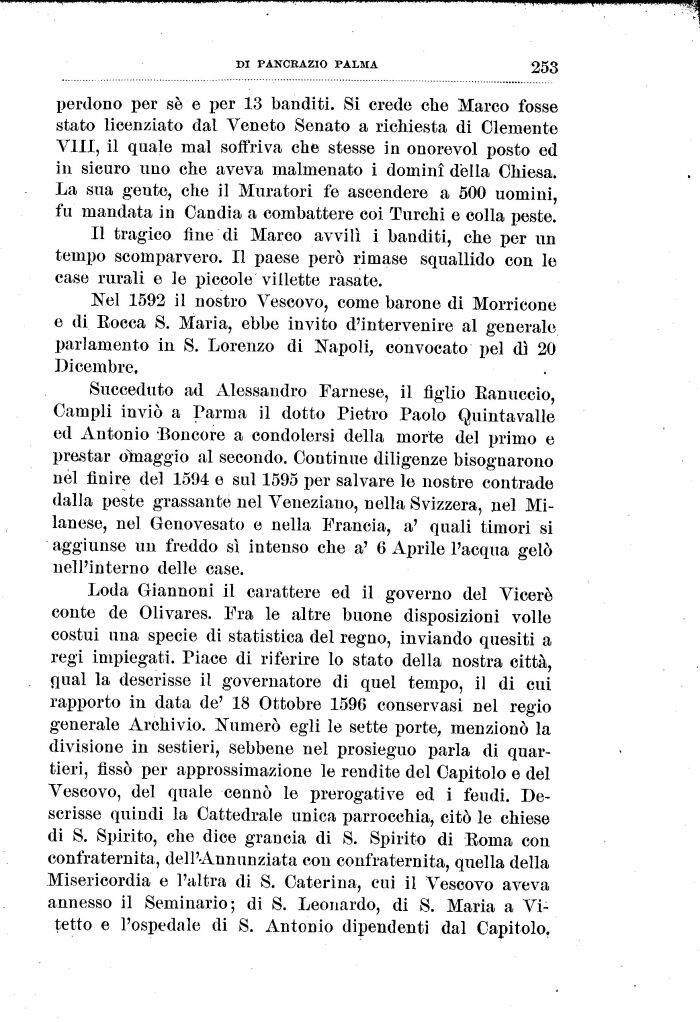 Loda Giannoni il carattere ed il governo del Viceré conte de Olivares. Fra le altre buone disposizioni volle costui una specie di statistica del regno, inviando quesiti a regi impiegati. Piace di riferire lo stato della nostra città, qual la descrisse il governatore di quel tempo, il di cui rapporto in data de' 18 Ottobre 1596 conservasi nel regio generale Archivio. Numerò egli le sette porte, menzionò la divisione in sestieri, sebbene nel prosieguo parla di quartieri, fissò per approssimazione le rendite del Capitolo e del Vescovo, del quale cenno le prerogative ed i feudi. Descrisse quindi la Cattedrale unica parrocchia, citò le chiese di S. Spirito, che dice grancia di S. Spirito di Eoma con confraternita, dell'Aununziata con confraternita, quella della Misericordia e l'altra di S. Caterina, cui il Vescovo aveva annesso il Seminario; di S. Leonardo, di S. Maria a Vi-tetto e l'ospedale di S. Antonio dipendenti dal Capitolo.