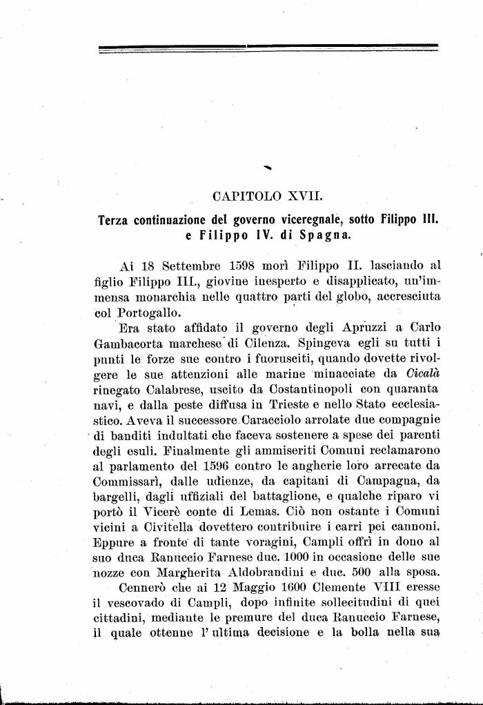 Era stato affidato il governo degli Apruzzi a Carlo Gambacorta marchese di Cilenza. Spingeva egli su tutti i punti le forze sue contro i fuorusciti, quando dovette rivolgere le sue attenzioni alle marine minacciate da Cicala rinegato Calabrese, uscito da Costantinopoli con quaranta navi, e dalla peste diffusa in Trieste e nello Stato ecclesiastico. Aveva il successore Caracciolo arrolate due compagnie di banditi indultati che faceva sostenere a spese dei parenti degli esuli. Finalmente gli ammiseriti Comuni reclamarono al parlamento del 1596 contro le angherie loro arrecate da Commissarì, dalle udienze, da capitani di Campagna, da bargelli, dagli uffiziali del battaglione, e qualche riparo vi portò il Viceré conte di Lemas. Ciò non ostante i Comuni vicini a Oivitella dovettero contribuire i carri pei cannoni. Eppure a fronte di tante voragini, Campii offrì in dono al suo duca Ranuccio Farnese due. 1000 in occasione delle sue nozze con Margherita Aldobrandiui e due. 500 alla sposa.