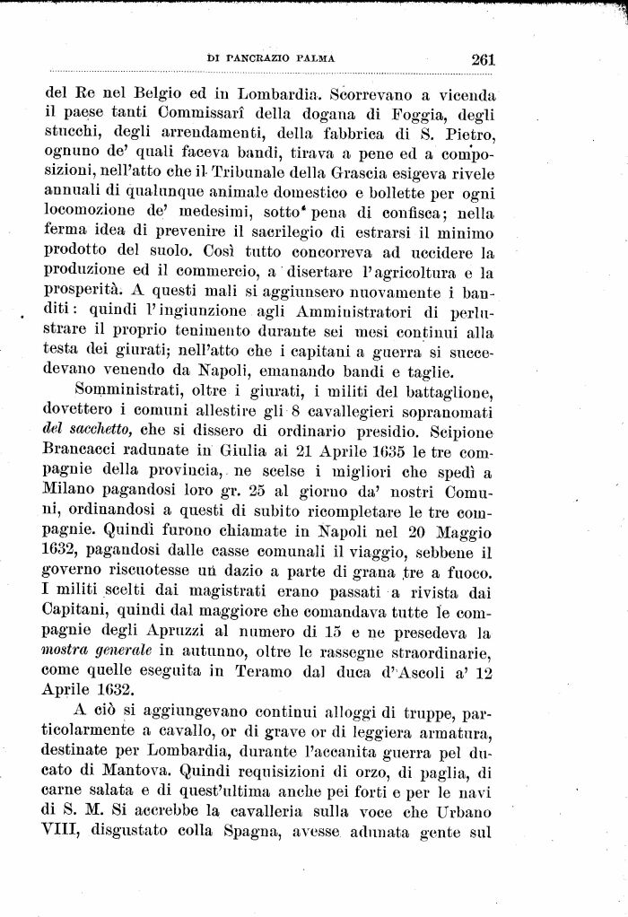 Somministrati, oltre i giurati, i militi del battaglione, dovettero i comuni allestire gli 8 cavallegieri sopranomati del sacchetto, che si dissero di ordinario presidio. Scipione Brancacci radunate in Giulia ai 21 Aprile 1635 le tre compagnie della provincia,. ne scelse i migliori che spedì a Milano pagandosi loro gr. 25 al giorno da' nostri Comuni, ordinandosi a questi di subito ricompletare le tre compagnie. Quindi furono chiamate in Napoli nel 20 Maggio 1632, pagandosi dalle casse comunali il viaggio, sebbene il governo riscuotesse un dazio a parte di grana ,tre a fuoco. I militi scelti dai magistrati erano passati a rivista dai Capitani, quindi dal maggiore che comandava tutte le compagnie degli Apruzzi al numero di 15 e ne presedeva la mostra generale in autunno, oltre le rassegne straordinarie, come quelle eseguita in Te-ramo dal duca d'Ascoli a' 12 Aprile 1632.