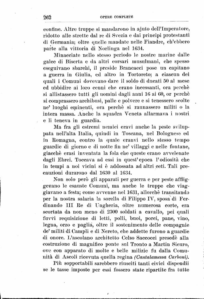 Non solo però gli apparati per guerra e per peste affliggevano le esauste Comuni, ma anche le truppe che viaggiavano a festa; come avvenne nel 1631, allorché transitando per la nostra salaria la sorella di Filippo IV, sposa di Fer-dinando III Re di Ungheria, oltre numerosa corte, era scortata da non meno di 2300 soldati a cavallo, pei quali fuvvi requisizione di letti, polli, buoi, porci, pane, vino, legna, orzo e paglia', oltre il sostenimento delle compagnie de' militi di Campii e di Nereto, che addette furono a guardie di onore. L'ascolano architetto Gelso Saccocci presedè alla costruzione di magnifico ponte sul Tronto a Martin Sicuro, ove con apparato di molte e belle milizie fu dalla Comunità di Ascoli ricevuta quella regina (Cantalamessa Carboni).