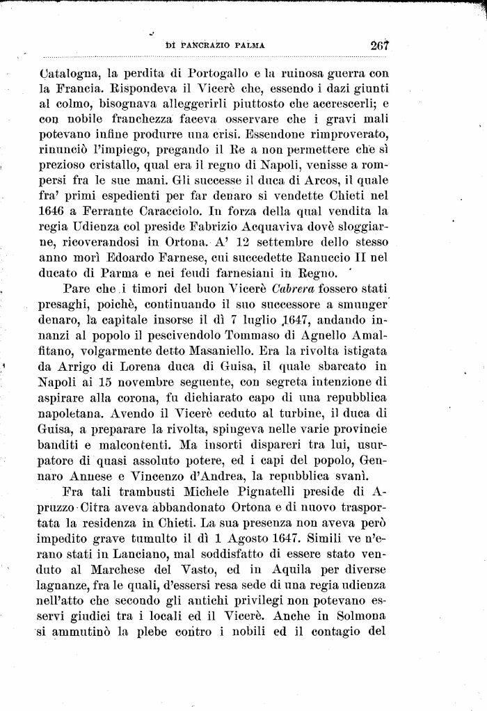 Fra tali trambusti Michele Pignatelli preside di A-pruzzo • Oitra aveva abbandonato Ortona e di nuovo trasportata la residenza in Chieti. La sua presenza non aveva però impedito grave tumulto il dì 1 Agosto 1647. Simili ve n'erano stati in Lanciano, mal soddisfatto di essere stato venduto al Marchese del Vasto, ed in Aquila per diverse lagnanze, fra le quali, d'essersi resa sede di una regia udienza nell'atto che secondo gli antichi privilegi non potevano esservi giudici tra i locali ed il Viceré. Anche in Solmona si ammutinò la plebe contro i nobili ed il contagio del