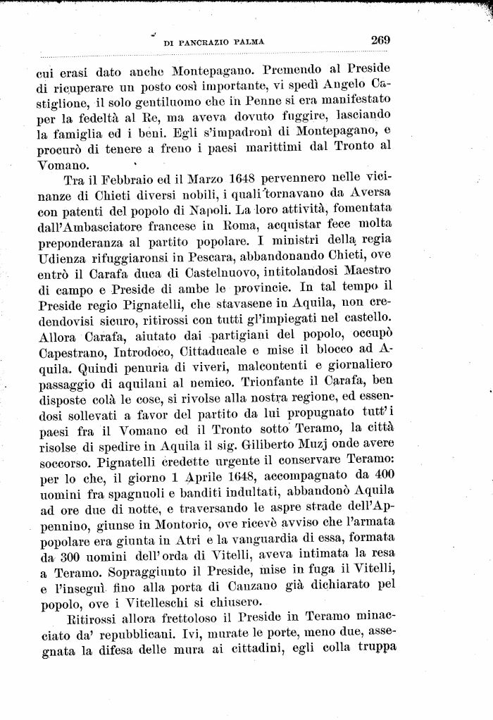 Tra il Febbraio ed il Marzo 1648 pervennero nelle vicinanze di Chieti diversi nobili, i quali'.tornavano da Aversa con patenti del popolo di Napoli. La loro attività, fomentata dall'Ambasciatore francese in Roma, acquistar fece molta preponderanza al partito popolare. I ministri della regia Udienza rifuggiaronsi in Pescara, abbandonando Chieti, ove entrò il Oarafa duca di Oastelnuovo, intitolandosi Maestro di campo e Preside di ambe le provincie. In tal tempo il Preside regio Pignatelli, che stavasene in Aquila, non cre-dendovisi sicuro, ritirossi con tutti gl'impiegati nel castello. Allora Oarafa, aiutato dai partigiani del popolo, occupò Oapestrano, Introdoco, Oittadticale e mise il blocco ad A-quila. Quindi penuria di viveri, malcontenti e giornaliero passaggio di aquilani al nemico. Trionfante il Oarafa, ben disposte colà le cose, si rivolse alla nostra regione, ed essendosi sollevati a favor del partito da lui propugnato tutt'i paesi fra il Vomano ed il Trento sotto Teramo, la città risolse di spedire in Aquila il sig. Giliberto Muzj onde avere soccorso. Pignatelli credette urgente il conservare Teramo: per lo che, il giorno 1 Aprile 1648, accompagnato da 400 uomini fra spagnuoli e banditi indultati, abbandonò Aquila ad ore due di notte, e traversando le aspre strade dell'Ap-pennino, giunse in Montorio, ove ricevè avviso che l'armata popolare era giunta in Atri e la vanguardia di essa, formata da 300 uomini dell' orda di Vitelli, aveva intimata la resa a Teramo. Sopraggiunto il Preside, mise in fuga il Vitelli, e l'inseguì fino alla porta di Ganzano già dichiarato pel popolo, ove i Vitelleschi si chiusero.