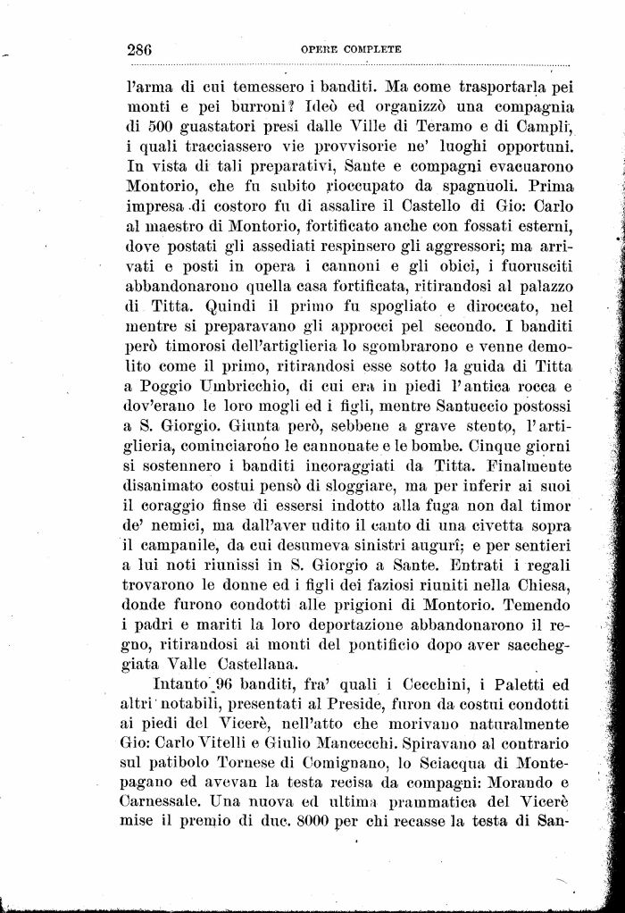 l'arma di cui temessero i banditi. Ma come trasportarla pei monti e pei burroni! Ideò ed organizzò una compagnia di 500 guastatori presi dalle Ville di Teramo e di Campii, i quali tracciassero vie provvisorie ne' luoghi opportuni. In vista di tali preparativi, Sante e compagni evacuarono Montorio, che fu subito rioccupato da spagnuoli. Prima impresa .di costoro fu di assalire il Castello di Gio: Carlo al maestro di Montorio, fortificato anche con fossati esterni, dove postati gli assediati respinsero gli aggressori; ma arrivati e posti in opera i cannoni e gli obici, i fuorusciti abbandonarono quella casa fortificata, ritirandosi al palazzo di Titta. Quindi il primo fu spogliato e diroccato, nel mentre si preparavano gli approcci pel secondo. I banditi però timorosi dell'artiglieria lo sgombrarono e venne demolito come il primo, ritirandosi esse sotto la guida di Titta a Poggio Umbricchio, di cui era in piedi l'antica rocca e dov'erano le loro mogli ed i figli, mentre Santuccio postossi a 8. Giorgio. Giunta però, sebbene a grave stento, l'artiglieria, cominciarono le cannonate e le bombe. Cinque giorni si sostennero i banditi incoraggiati da Titta. Finalmente disanimato costui pensò di sloggiare, ma per inferir ai suoi il coraggio finse di essersi indotto alla fuga non dal tirnor de' nemici, ma dall'aver udito il cauto di una civetta sopra il campanile, da cui desumeva sinistri auguri; e per sentieri a lui noti riunissi in S. Giorgio a Sante. Entrati i regali trovarono le donne ed i figli dei faziosi riuniti nella Chiesa, donde furono condotti alle prigioni di Montorio. Temendo i padri e mariti la loro deportazione abbandonarono il regno, ritirandosi ai monti del pontificio dopo aver saccheggiata Valle Castellana.