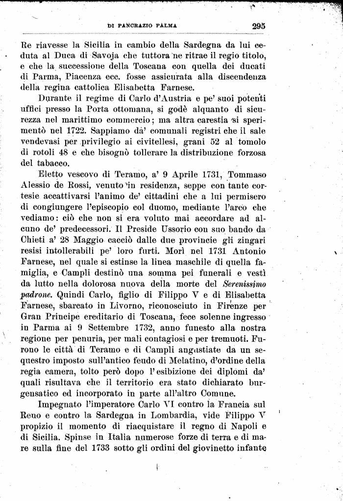 Eletto vescovo di Teramo, a' 9 Aprile 1731, Tommaso Alessio de Eossi, venuto Mu residenza, seppe con tante cortesie accattivarsi l'animo de' cittadini che a lui permisero di congiungere l'episcopio col duomo, mediante l'arco che vediamo : ciò che non si era voluto mai accordare ad alcuno de' predecessori. Il Preside Ussorio con suo bando da Chieti a' 28 Maggio cacciò dalle due provincie gli zingari resisi intollerabili pe' loro furti. Morì nel 1731 Antonio Farnese, nel quale si estinse la linea maschile di quella famiglia, e Campii destinò una sovnma pei funerali e vestì da lutto nella dolorosa nuova della morte del Serenissimo padrone. Quindi Carlo, figlio di Filippo V e di Elisabetta Farnese, sbarcato in Livorno, riconosciuto in Firenze per Gran Principe ereditario di Toscana, fece solenne ingresso in Parma ai 9 Settembre 1732, anno funesto alla nostra regione per penuria, per mali contagiosi e per tremuoti. Furono le città di Teramo e di Campii angustiate da un sequestro imposto sull'antico feudo di Melatino, d'ordine della regia camera, tolto però dopo l'esibizione dei diplòmi da' quali risultava che il territorio era stato dichiarato bur-geusatico ed incorporato in parte all'altro Comune.