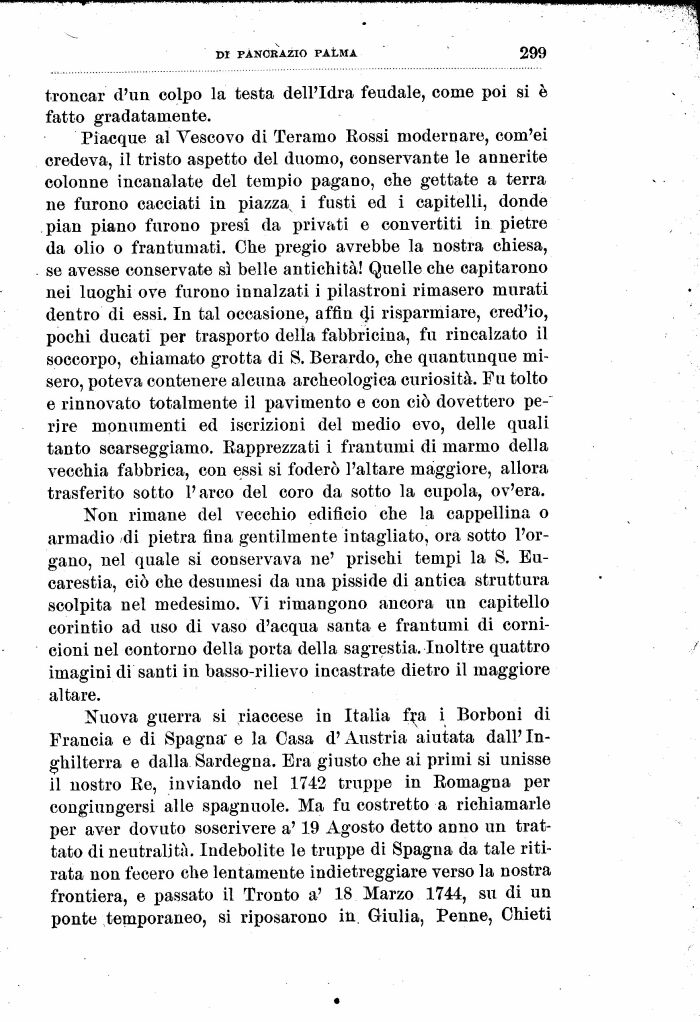 Piacque al Vescovo di Teramo Rossi modernare, com'ei credeva, il tristo aspetto del duomo, conservante le annerite colonne incanalate del tempio pagano, che gettate a terra ne furono cacciati in piazza^ i fusti ed i capitelli, donde pian piano furono presi da privati e convertiti in pietre da olio o frantumati. Che pregio avrebbe la nostra chiesa, se avesse conservate sì belle antichità! Quelle che capitarono nei luoghi ove furono innalzati i pilastroni rimasero murati dentro di essi. In tal occasione, affin