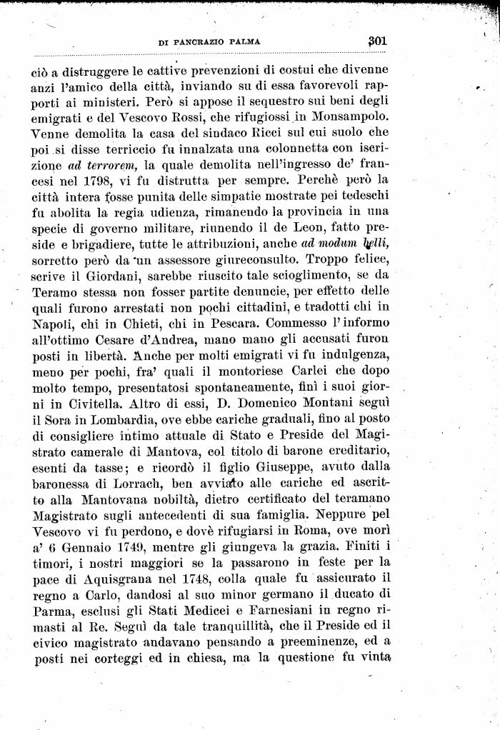 ciò a distruggere le cattive prevenzioni di costui che divenne anzi l'amico della città, inviando su di essa favorevoli rapporti ai ministeri. Però si appose il sequestro sui beni degli emigrati e del Vescovo Eossi, che rifugi ossi in Monsampolo. Venne demolita la casa del sindaco Ricci sul cui suolo che poi si disse terriccio fu innalzata una colonnetta con iscrizione ad terrorem, la quale demolita nell'ingresso de' francesi nel 1798, vi fu distrutta per sempre. Perché però la città intera fosse punita delle simpatie mostrate pei tedeschi fu abolita la regia udienza, rimanendo la provincia in una specie di governo militare, riunendo il de Leon, fatto preside e brigadiere, tutte le attribuzioni, anche ad modum tylli, sorretto però da'un assessore giureconsulto. Troppo felice, scrive il Giordani, sarebbe riuscito tale scioglimento, se da Terarno stessa non fosser partite denuncie, per effetto delle quali furono arrestati non pochi cittadini, e tradotti chi in Napoli, chi in Chieti, chi in Pescara. Commesso l'informo all'ottimo Cesare d'Andrea, mano mano gli accusati furon posti in libertà. Anche per molti emigrati vi fu indulgenza, meno per pochi, fra' quali il montoriese Carlei che dopo molto tempo, presentatosi spontaneamente, finì i suoi giorni in Civitella. Altro di essi, D. Domenico Montani seguì il Sora in Lombardia, ove ebbe cariche graduali, fino al posto di consigliere intimo attuale di Stato e Preside del Magistrato camerale di Mantova, col titolo di barone ereditario, esenti da tasse; e ricordò il figlio Giuseppe, avuto dalla baronessa di Lorrach, ben avviato alle cariche ed ascritto alla Mantovana nobiltà, dietro certificato del teramano Magistrato sugli antecedenti di sua famiglia. Neppure pel Vescovo vi fu perdono, e dovè rifugiarsi in Roma, ove morì a' 6 Gennaio 1749, mentre gli giungeva la grazia. Finiti i timori, i nostri maggiori se la passarono in feste per la pace di Aquisgrana nel 1748, colla quale fu assicurato il regno a Carlo, dandosi al suo minor germano il ducato di Parma, esclusi gli Stati Medicei e Farnesiani in regno rimasti al Re. Seguì da tale tranquillità, che il Preside ed il civico magistrato andavano pensando a preeminenze, ed a posti nei corteggi ed in chiesa, ma la questione fu vinta