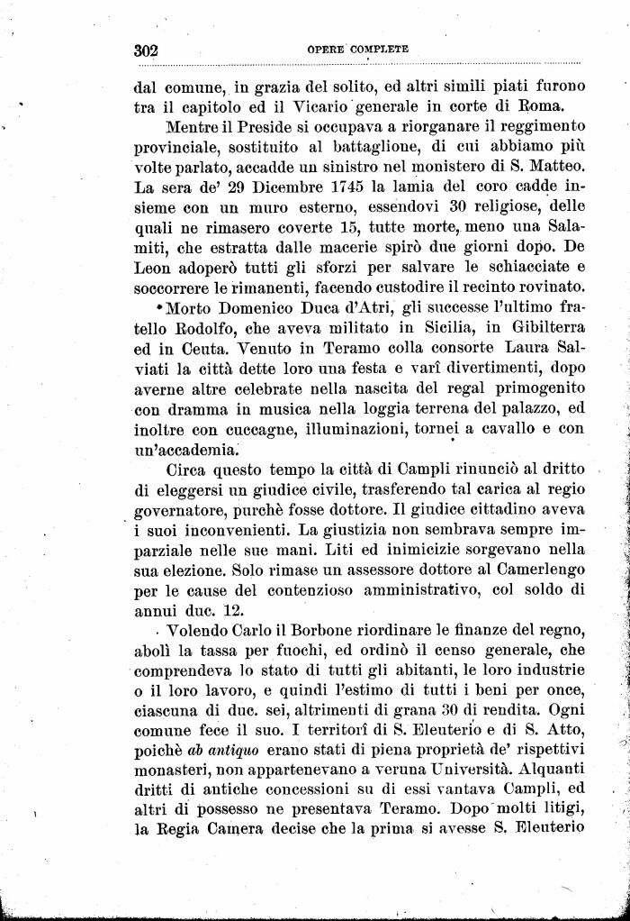 • Volendo Carlo il Borbone riordinare le finanze del regno, abolì la tassa per fuochi, ed ordinò il censo generale, che comprendeva lo stato di tutti gli abitanti, le loro industrie o il loro lavoro, e quindi l'estimo di tutti i beni per once, ciascuna di due. sei, altrimenti di grana 30 di rendita. Ogni comune fece il suo. I territorì di S. Eleuterio e di S. Atto, poiché ab antiquo erano stati di piena proprietà de' rispettivi monasteri, non appartenevano a veruna Università. Alquanti dritti di antiche concessioni su di essi vantava Campii, ed altri di possesso ne presentava Teramo. Dopo molti litigi, la Eegia Camera decise che la prima si avesse S, Kleuterip