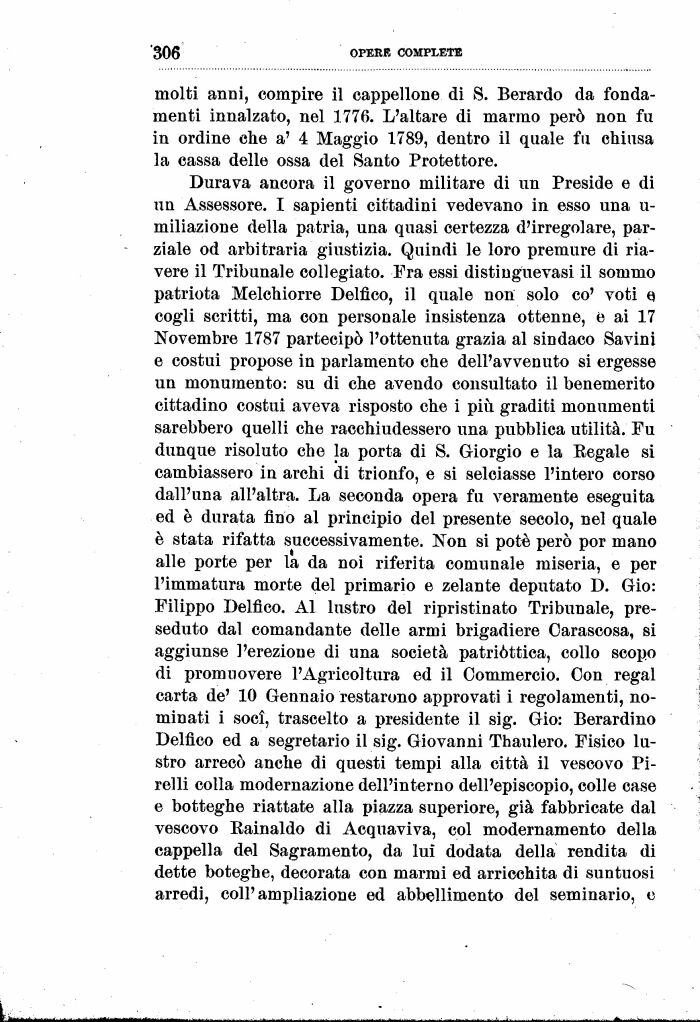 Durava ancora il governo militare di un Preside e di un Assessore. I sapienti cittadini vedevano in esso una u-miliazione della patria, una quasi certezza d'irregolare, parziale od arbitraria giustizia. Quindi le loro premure di riavere il Tribunale collegiata. Fra essi distiuguevasi il sommo patriota Melchiorre Delfico, il quale non solo co' voti q cogli scritti, ma con personale insistenza ottenne, è ai 17 Novembre 1787 partecipò l'ottenuta grazia al sindaco Savini e costui propose in parlamento che dell'avvenuto si ergesse un monumento: su di che avendo consultato il benemerito cittadino costui aveva risposto che i più graditi monumenti sarebbero quelli che racchiudessero una pubblica utilità. Fu dunque risoluto che la porta di S. Giorgio e la Regale si cambiassero in archi di trionfo, e si selciasse l'intero corso dall'una all'altra. La seconda opera fu veramente eseguita ed è durata fino al principio del presente secolo, nel quale è stata rifatta successivamente. Non si potè però por mano alle porte per la da noi riferita comunale miseria, e per l'immatura morte del primario e zelante deputato D. Gio: Filippo Delfico. Al lustro del ripristinato Tribunale, preseduto dal comandante delle armi brigadiere Oarascosa, si aggiunse l'erezione di una società patriòttica, collo scopo di promuovere l'Agricoltura ed il Commercio. Con regal carta de' 10 Gennaio restarono approvati i regolamenti, nominati i soci, trascelto a presidente il sig. Gio: Berardino Delfico ed a segretario il sig. Giovanni Thaulero. Fisico lustro arrecò anche di questi tempi alla città il vescovo Pi-relli colla modernazione dell'interno dell'episcopio, colle case e botteghe riattate alla piazza superiore, già fabbricate dal vescovo Eainaldo di Acquaviva, col modernamento della cappella del Sagramento, da luì dodata della rendita di dette boteghe, decorata con marmi ed arricchita di suntuosi arredi, coli'ampliazione ed abbellimento del seminario, e