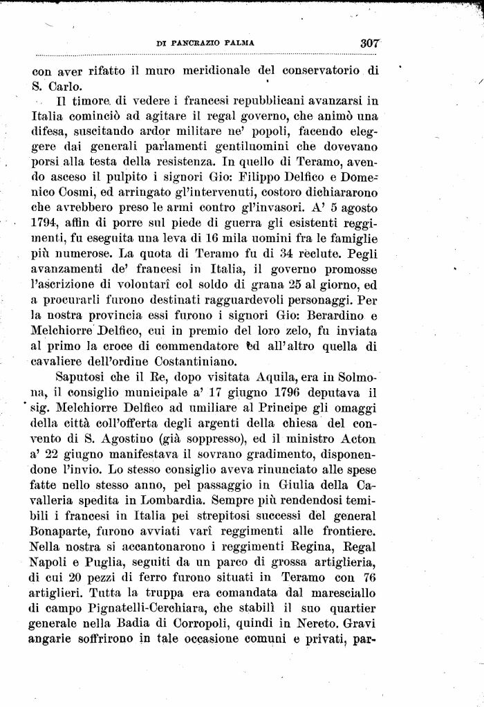 Il timore, di vedere i francesi repubblicani avanzarsi in Italia cominciò ad agitare il rogai governo, che animò una difesa, suscitando ardor militare ne' popoli, facendo eleggere dai generali parlamenti gentiluomini che dovevano porsi alla testa della resistenza. In quello di Teramo, avendo asceso il pulpito i signori Gio: Filippo Delfico e Domenico Cosmi, ed arringato gl'intervenuti, costoro dichiararono che avrebbero preso le armi contro gl'invasori. A' 5 agosto 1794, affln di porre sul piede di guerra gli esistenti reggimenti, fu eseguita una leva di 16 mila uomini fra le famiglie più numerose. La quota di Teramo fu di 34 recluto. Pegli avanzamenti de' francesi in Italia, il governo promosse l'ascrizione di voloutari col soldo di grana 25 al giorno, ed a procurarli furono destinati ragguardevoli personaggi. Per la nostra provincia essi furono i signori Gio: Berardino e Melchiorre Delfico, cui in premio del loro zelo, fu inviata al primo la croce di commendatore fed all'altro quella di cavaliere dell'ordine Costantiniano.