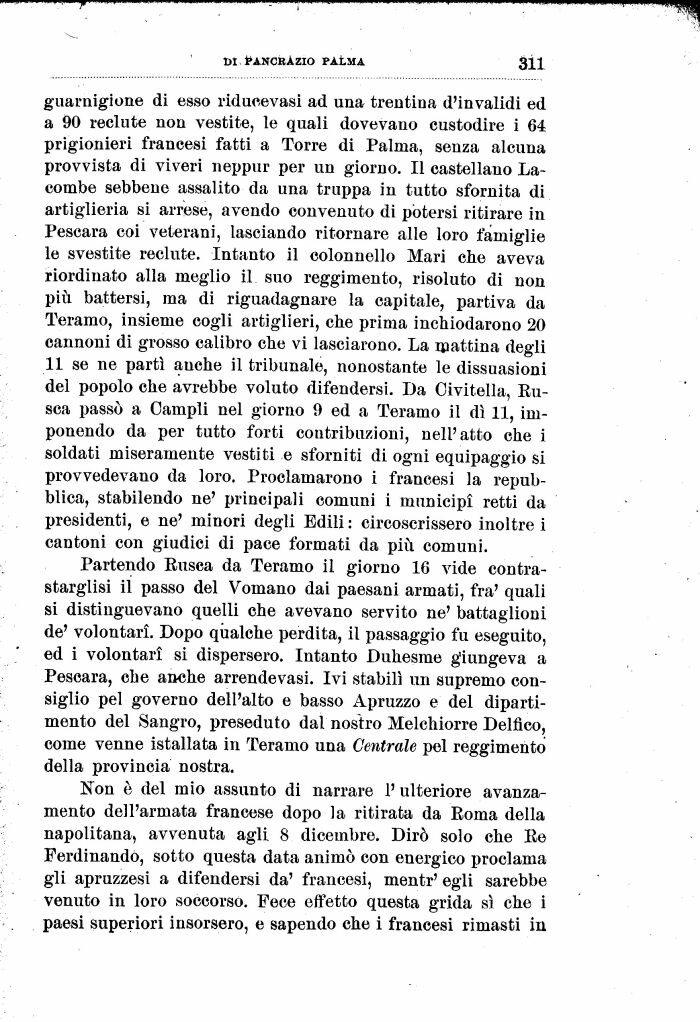guarnigione di esso riducevasi ad una trentina d'invalidi ed a 90 recinte non vestite, le quali dovevano custodire i 64 prigionieri francesi fatti a Torre di Palma, senza alcuna provvista di viveri neppur per un giorno. Il castellano La-combe sebbene assalito da una truppa in tutto sfornita di artiglieria si arrese, avendo convenuto di potersi ritirare in Pescara coi veterani, lasciando ritornare alle loro famiglie le svestite recinte. Intanto il colonnello Mari che aveva riordinato alla meglio il suo reggimento, risoluto di non più battersi, ma di riguadagnare la capitale, partiva da Teramo, insieme cogli artiglieri, che prima inchiodarono 20 cannoni di grosso calibro che vi lasciarono. La mattina degli 11 se ne partì anche il tribunale, nonostante le dissuasioni del popolo che avrebbe voluto difendersi. Da Oivitella, Busca passò a Campii nel giorno 9 ed a Teramo il dì 11, imponendo da per tutto forti contribuzioni, nell'atto che i soldati miseramente vestiti e sforniti di ogni equipaggio si provvedevano da loro. Proclamarono i francesi la repubblica, stabilendo ne' principali comuni i municipi retti da presidenti, e ne' minori degli Edili : circoscrissero inoltre i cantoni con giudici di pace formati da più comuni.