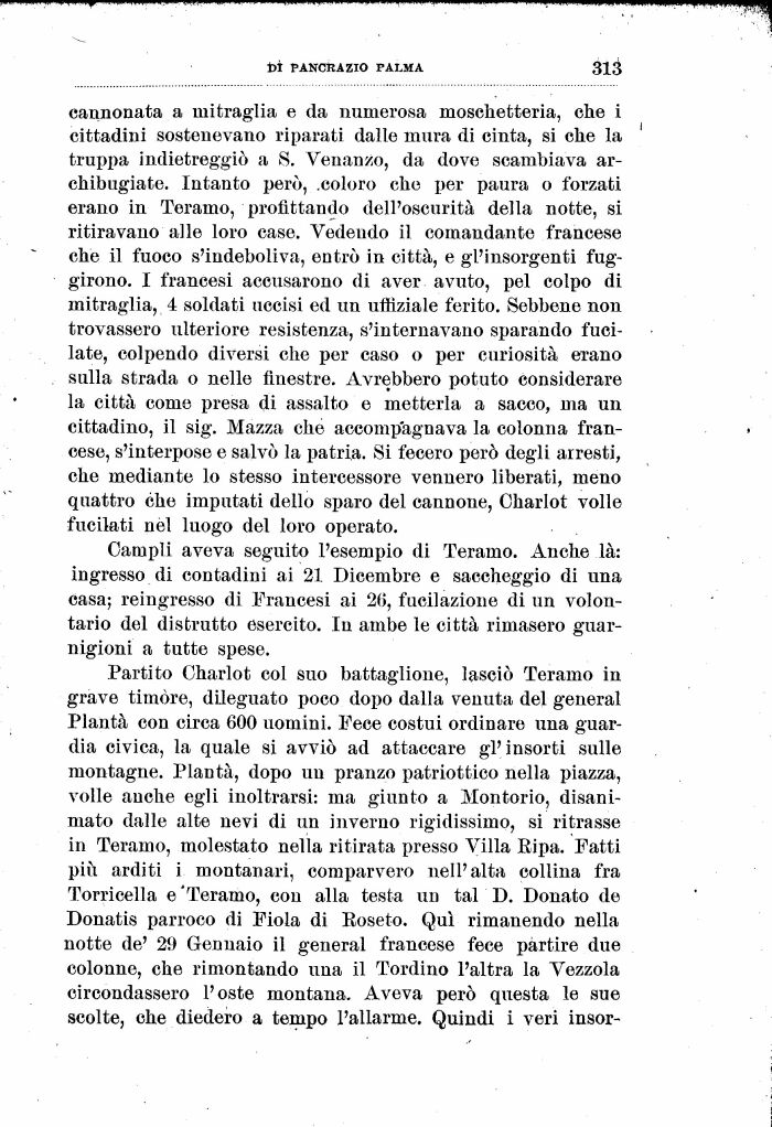 Partito Oharlot col suo battaglione, lasciò Teramo in grave timóre, dileguato poco dopo dalla venuta del generai Planta con circa 600 uomini. Pece costui ordinare una guardia civica, la quale si avviò ad attaccare gl'insorti sulle montagne. Planta, dopo un pranzo patriottico nella piazza, volle anche egli inoltrarsi: ma giunto a Montorio, disanimato dalle alte nevi di un inverno rigidissimo, si ritrasse in Teramo, molestato nella ritirata presso Villa Eipa. Fatti più arditi i montanari, comparvero nell'alta collina fra Torricella e'Teramo, con alla testa un tal D. Donato de Donatis parroco di Fiola di Roseto. Qui rimanendo nella notte de' 29 Gennaio il generai francese fece partire due colonne, che rimontando una il Tordino l'altra la Vezzola circondassero l'oste montana. Aveva però questa le sue scolte, che diedero a tempo l'allarme. Quindi i veri insor-