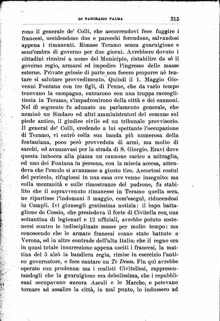 rono il generale de' Colli, che accorrendovi fece fuggire i francesi, uccidendone due e parecchi ferendone, salvandosi appena i rimanenti. Eimase Teramo senza guarnigione e senz'ombra di governo per due giorni. Avrebbero dovuto i cittadini riunirsi a nome del Municipio, ristabilire da sé il governo regio, armarsi ed impedire l'ingresso delle masse esterne. Private gelosie di parte non fecero proporre né tentare sì salutare provvedimento. Quindi il 1. Maggio Gio-venni Fontana con tre figli, di Penne, che da vario tempo tenevano la campagna, entrarono con una truppa raccogliticcia in Teramo, s'impadronirono della città e dei cannoni. Nel dì seguente fu adunato un parlamento generale, che nominò un Sindaco ed altri amministratori del comune sul piede antico, il giudice civile ed un tribunale provvisorio. Il generai de' Colli, credendo a lui spettante l'occupazione di Teramo, vi entrò colla sua banda più numerosa della fontaniana, poco però provveduta di armi, ma molto di sacchi, ed avanzavasi per la strada di S. Giorgio. Bravi dove questa imbocca alla piazza un cannone carico a mitraglia, ed uno dei Fontana in persona, con la miccia accesa, attendeva che l'emulo si avanzasse a giusto tiro. Accortosi costui del pericolo, rifugiossi in una casa ove venne inseguito: ma colla mezzanità e sulle rimostranze del padrone, fu stabilito che il sopravvenuto rimanesse in Teramo quella sera, ne ripartisse l'indomani 3 maggio, com'eseguì, riducendosi in Campii. Ivi giunsegli gratissima notizia : il 'capa battaglione de Cossio, che presiedeva il forte di Ci vitella con, una settantina di legionarl e 12 uffiziali, avrebbe potuto sostenersi contro le indisciplinate masse per molto tempo: ma conoscendo che le armate francesi erano state battute a Verona, ed in altre contrade dell'alta Italia; che il regno era in quasi totale insurrezione appena usciti i francesi, la mattina del 3 alzò la bandiera regia, rimise in esercizio l'antico governatore, e fece cantare un Te Dewm. Fin qui avrebbe operato con prudenza: ma i realisti Civitellesi, rappresentandogli che la guarnigione era debolissima, che i repubblicani occupavano ancora Ascoli e le Marche, e potevano tornare ad assalire la città, in mal punto, lo indussero ad