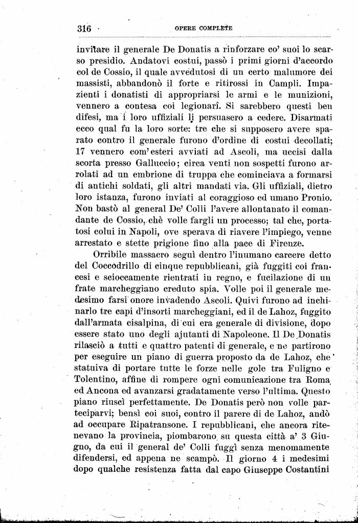 Orribile massacro seguì dentro l'inumano carcere detto del Coccodrillo di cinque repubblicani, già fuggiti coi francesi e scioccamente rientrati in regno, e fucilazione di un frate marcheggiano creduto spia. Volle poi il generale medesimo farsi onore invadendo Ascoli. Quivi furono ad inchinarlo tre capi d'insorti marcheggiani, ed il de Lahoz, fuggito dall'armata cisalpina, di cui era generale di divisione, dopo essere stato uno degli ajutanti di Napoleone. Il De .Donatis rilasciò a tutti e quattro patenti di generale, e ne partirono per eseguire un piano di guerra proposto da de Lahoz, che ' statuiva di portare tutte le forze nelle gole tra Fuligno e Tolentino, affine di rompere ogni comunicazione tra Eoma ed Ancona ed avanzarsi gradatamente verso l'ultima. Questo piano riuscì perfettamente. De Donatis però non ralle parteciparvi; bensì coi suoi, contro il parere di de Lahoz, andò ad occupare Eipatransone. I repubblicani, che ancora ritenevano la provincia, piombarono su questa città a' 3 Giugno, da cui il generai de' Colli fuggì senza menomamente difendersi, ed appena ne scampò. Il giorno 4 i medesimi dopo qualche resistenza fatta dal capo Giuseppe Costantini