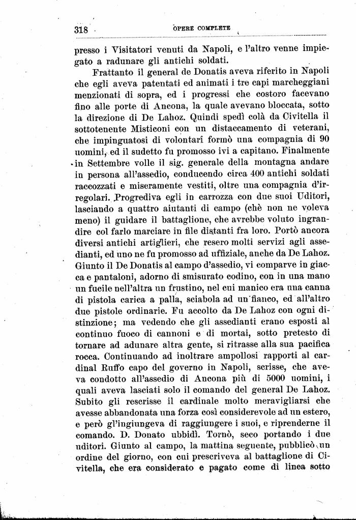 Frattanto il generai de Donatis aveva riferito in Napoli che egli aveva patentati ed animati i tre capi marcheggiani menzionati di sopra, ed i progressi che costoro facevano fino alle porte di Ancona, la quale avevano bloccata, sotto la direzione di De Lahoz. Quindi spedì colà da Oivitella il sottotenente Misticoni con un distaccamento di veterani, che impinguatosi di volontarì formò una compagnia di 90 uomini, ed il sudetto fu promosso ivi a capitano. Finalmente • in Settembre volle il sig. generale della montagna andare in persona all'assedio, conducendo circa 400 antichi soldati raccozzati e miseramente vestiti, oltre una compagnia d'irregolari. Progrediva egli in carrozza con due suoi Uditori, lasciando a quattro aiutanti di campo (che non ne voleva meno) il guidare il battaglione, che avrebbe voluto ingrandire col farlo marciare in file diatanti fra loro. Portò ancora diversi antichi artiglieri, che resero molti servizi agli assedianti, ed uno ne fu promosso ad uffiziale, anche da De Lahoz. Giunto il De Donatis al campo d'assedio, vi comparve in giacca e pantaloni, adorno di smisurato codino, con in una mano un fucile nell'altra un frustino, nel cui manico era una canna di pistola carica a palla, sciabola ad un'fianco, ed all'altro due pistole ordinarie. Fu accolto da De Lahoz con ogni distinzione; ma vedendo che gli assedianti erano esposti al continuo fuoco di cannoni e di mortai, sotto pretesto di tornare ad adunare altra gente, si ritrasse alla sua pacifica rocca. Continuando ad inoltrare ampollosi rapporti al car-dinal Buffo capo del governo in Napoli, scrisse, che aveva condotto all'assedio di Ancona più di 5000 uomini, i quali aveva lasciati solo il comando del generai De Lahoz. Subito gli rescrisse il cardinale molto meravigliarsi che avesse abbandonata una forza così considerevole ad un estero, e però gl'ingiungeva di raggiungere i suoi, e riprenderne il comando. D. Donato ubbidì. Tornò, seco portando i due uditori. Giunto al campo, la mattina seguente, pubblicò uin ordine del giorno, con cui prescriveva al battaglione di Oivitella, che era considerato e pagato come di linea sotto