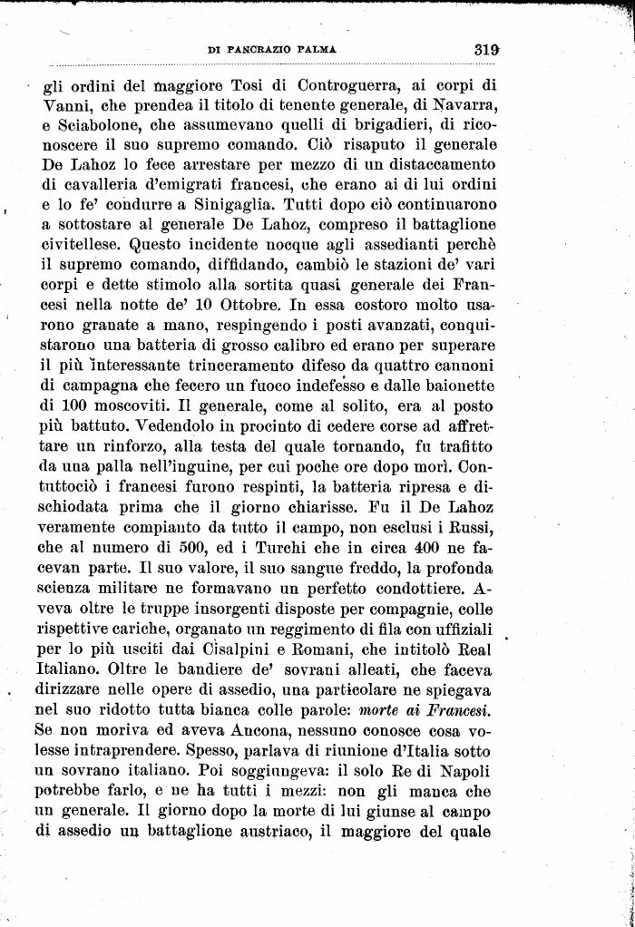gli ordini del maggiore Tosi di Controguerra, ai corpi di Vanni, che prendea il titolo di tenente generale, di Na varrà, e Sciabolone, che assumevano quelli di brigadieri, di riconoscere il suo supremo comando. Ciò risaputo il generale De Lahoz lo fece arrestare per mezzo di un distaccamento di cavalleria d'emigrati francesi, che erano ai di lui ordini e lo fé' condurre a Sinigaglia. Tutti dopo ciò continuarono a sottostare al generale De Lahoz, compreso il battaglione civitellese. Questo incidente nocque agli assedianti perché il supremo comando, diffidando, cambiò le stazioni de' vari corpi e dette stimolo alla sortita quasi generale dei Francesi nella notte de' 10 Ottobre. In essa costoro molto usarono granate a mano, respingendo i posti avanzati, conquistarono una batteria di grosso calibro ed erano per superare il più. interessante trinceramento difeso da quattro cannoni di campagna che fecero un fuoco indefesso e dalle baionette di 100 moscoviti. Il generale, come al solito, era al posto più battuto. Vedendolo in procinto di cedere corse ad affrettare un rinforzo, alla testa del quale tornando, fu trafitto da una palla nell'inguine, per cui poche ore dopo morì. Oon-tuttociò i francesi furono respinti, la batteria ripresa e dischiodata prima che il giorno chiarisse. Fu il De Lahoz veramente compianto da tutto il campo, non esclusi i Bussi, che al numero di 500, ed i Turchi che in circa 400 ne fa-cevan parte. Il suo valore, il suo sangue freddo, la profonda scienza militare ne formavano un perfetto condottiere. A-veva oltre le truppe insorgenti disposte per compagnie, colle rispettive cariche, organato un reggimento di fila con uffiziali per lo più usciti dai Cisalpini e Eomani, che intitolò Beai Italiano. Oltre le bandiere de' sovrani alleati, che faceva dirizzare nelle opere di assedio, una particolare ne spiegava nel suo ridotto tutta bianca colle parole: morte ai Francesi. Se non moriva ed aveva Ancona, nessuno conosce cosa volesse intraprendere. Spesso, parlava di riunione d'Italia sotto un sovrano italiano. Poi soggiungeva: il solo Be di Napoli potrebbe farlo, e ne ha tutti i mezzi: non gli manca che un generale. Il giorno dopo la morte di lui giunse al campo di assedio un battaglione austriaco, il maggiore del quale